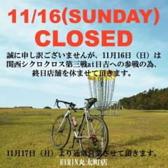 誠に申し訳ございませんが、11/16(日)は、関西シクロクロス第3戦へ参加のため、終日店舗を休業させて頂きます。 *詳しくはコチラ 11/17(月)より通常営業させて頂きます。 エイリン他店舗は通常営業となっております。... View Article