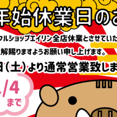 いつもご利用いただき、誠にありがとうございます。 下記の7日間、誠に勝手ながらエイリン全店年末年始休業とさせていただきます。 2018年12月29日(土)~2019年1月4日(金) 新年は1月5日(土)より通常営業を開始... View Article