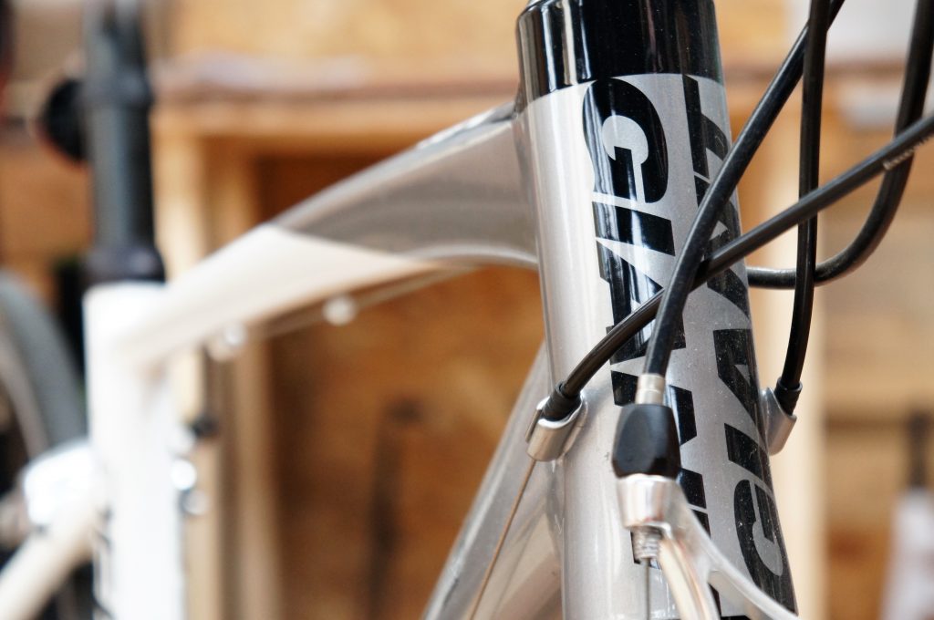 トップチューブはヘッドチューブ側では太めに成型。ヘッドチューブにしっかりと溶接する事で、ハンドルコントロールや剛性に貢献。