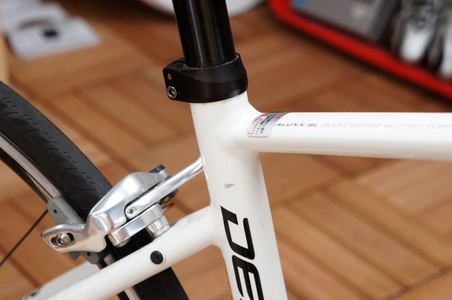 近年では主流となりだした、コンパクト設計ですが、昔ながらのホリゾンタル成型フレームよりもトップチューブがスローピングし、シートチューブ長がコンパクトになった事が特徴的。