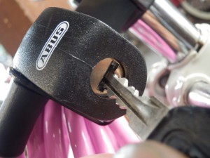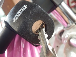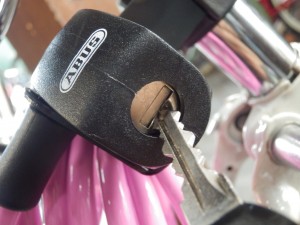 後は取り外したカギを自転車のフレーム、ホイール、そして柵や電柱などの建物と