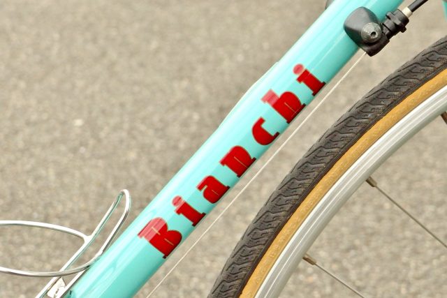 ポリッシュのメッキラグとBianchiのチェレステカラーで細身でシンプルなクロモリフレームがカッコいいロードバイク。