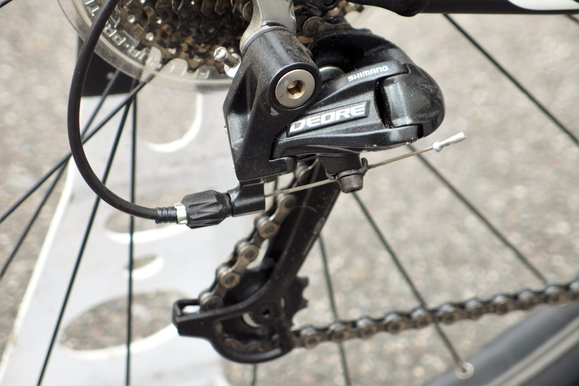 フロント・リアディレイラーともに「シマノ」の「DEORE」で、エントリークラスのマウンテンバイク用コンポですね!