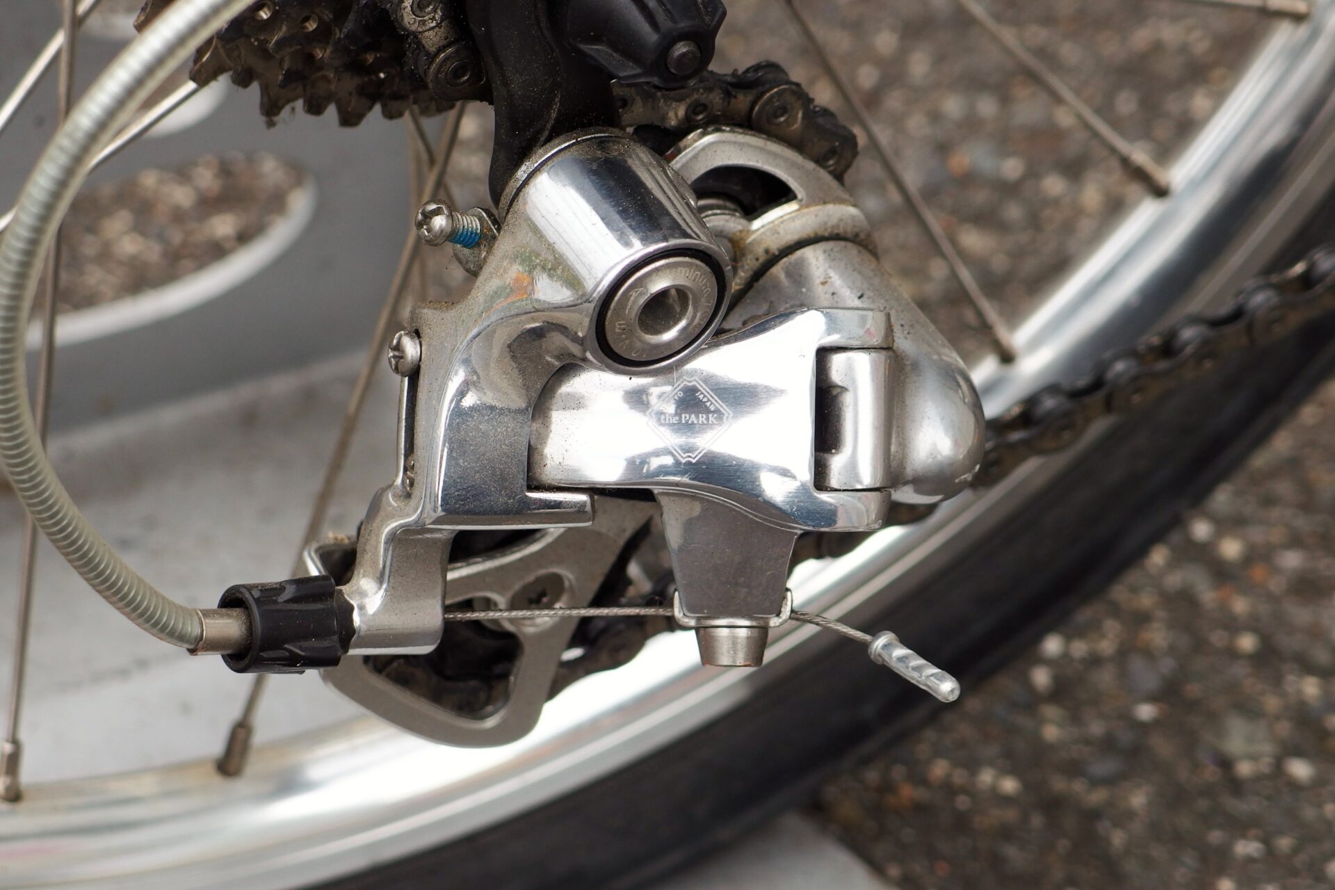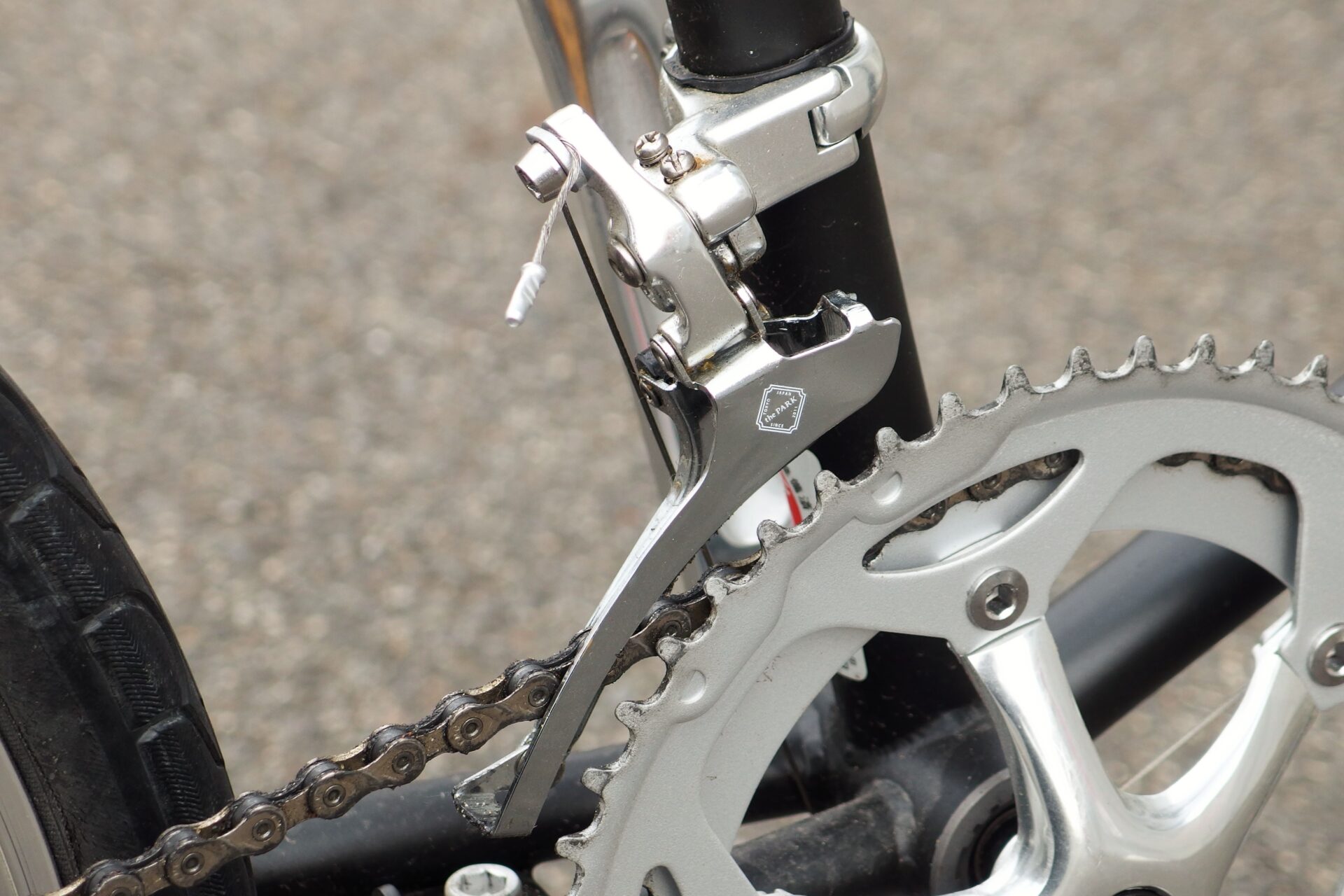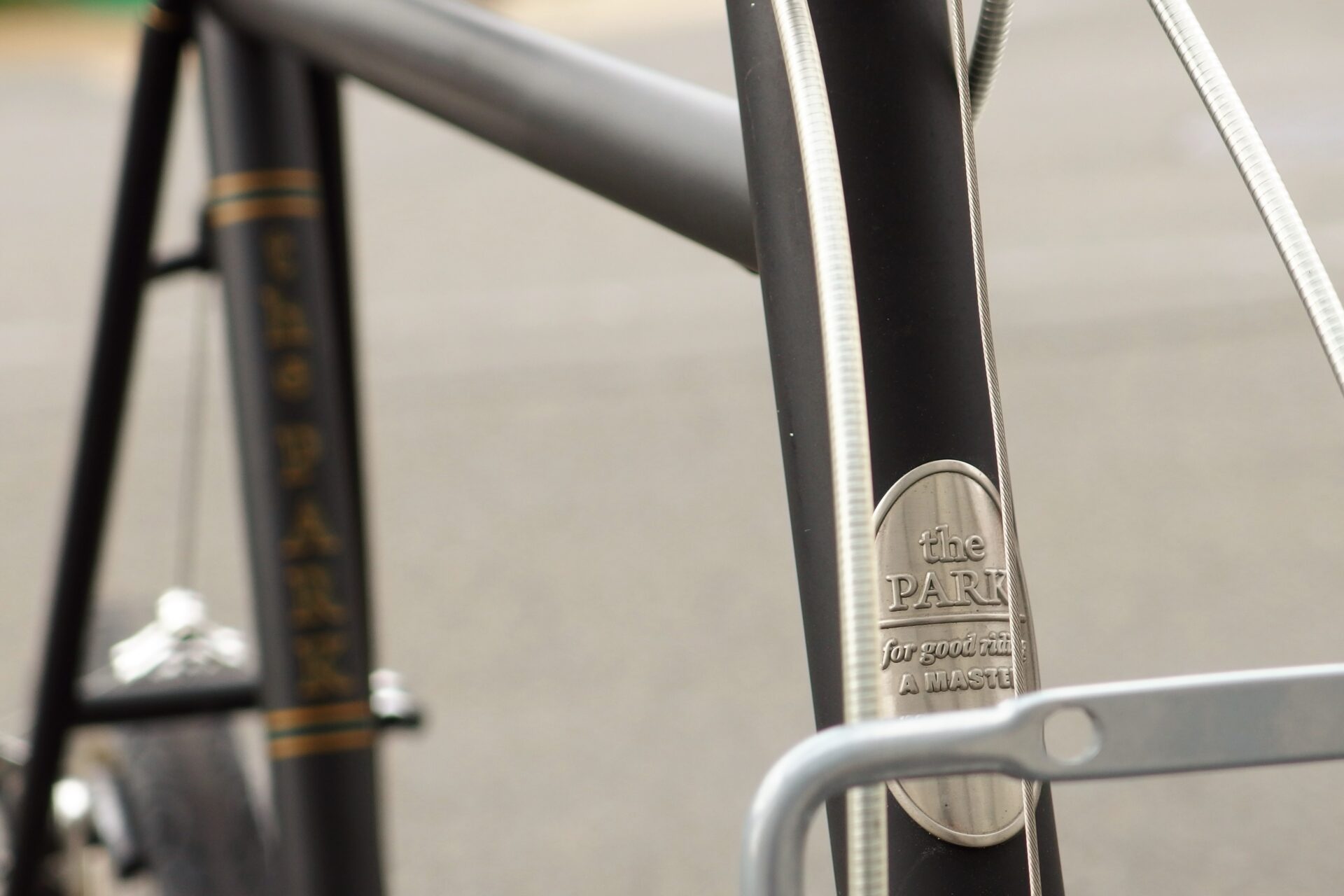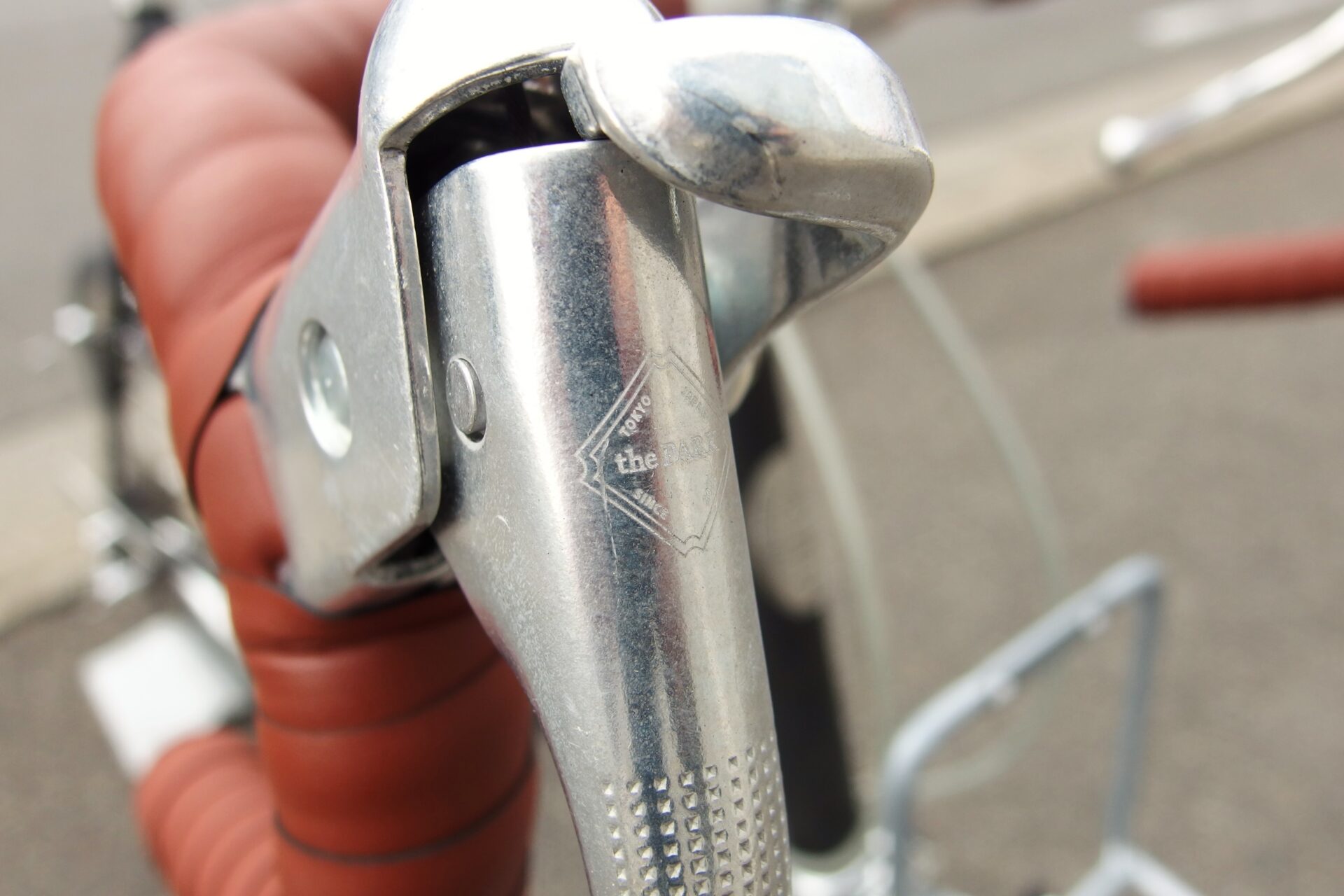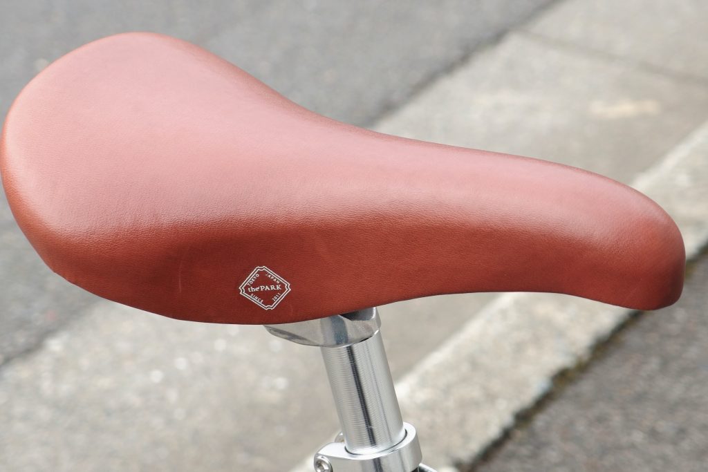 クッション性の高いサドルやブレーキレバー、フロント・リアディレイラーにまで「the park」のロゴが入っていてオシャレ!