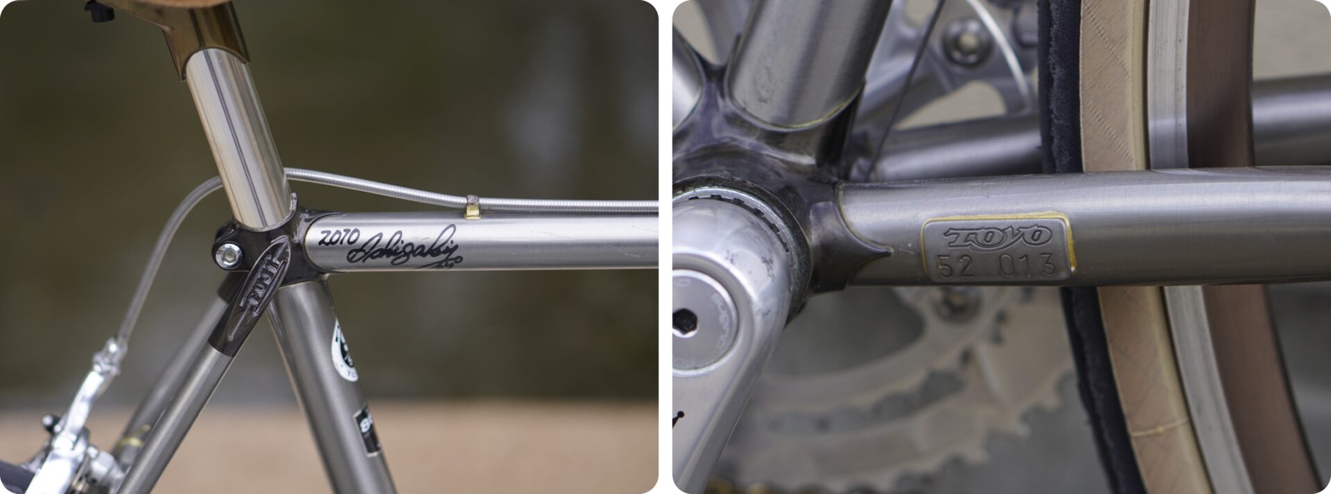 更にフレーム製造を手掛けた東洋フレームの石垣鉄也氏のサインがトップチューブに。1本1本に~作り手の証~が刻まれています。