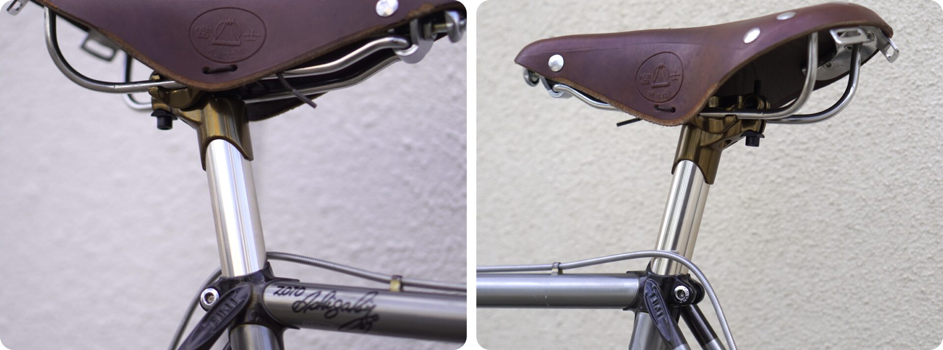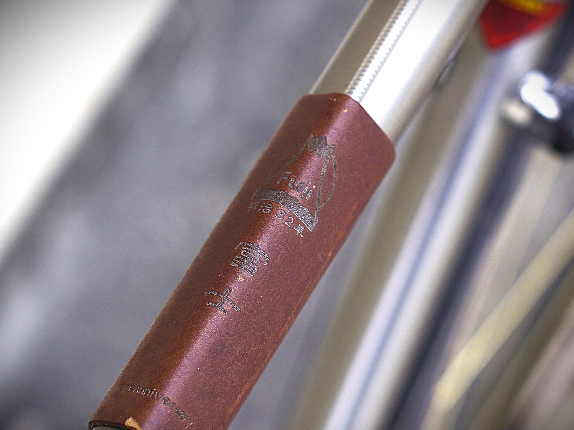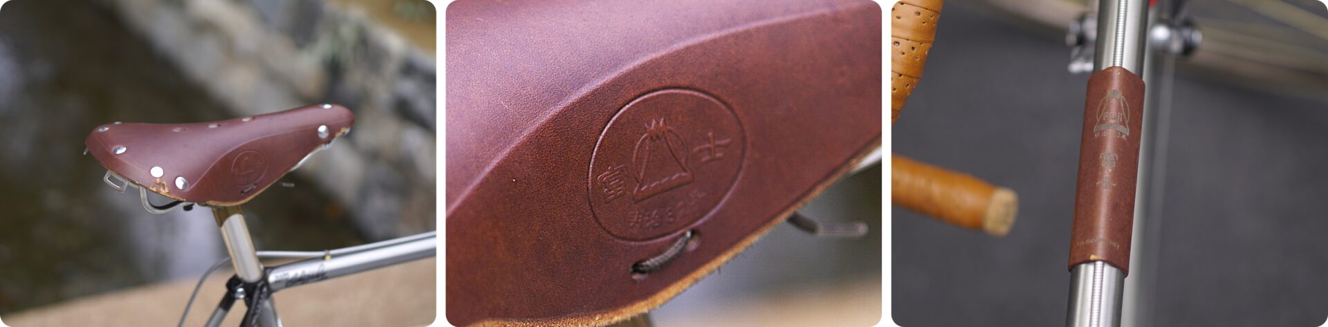 リベットの打たれた味のあるレザーサドル(サイドのキズが少し残念、、、)のサイドに、またトップチューブカバーには堂々とFUJI(富士)マークと”明治32年”と創業年の刻印が。