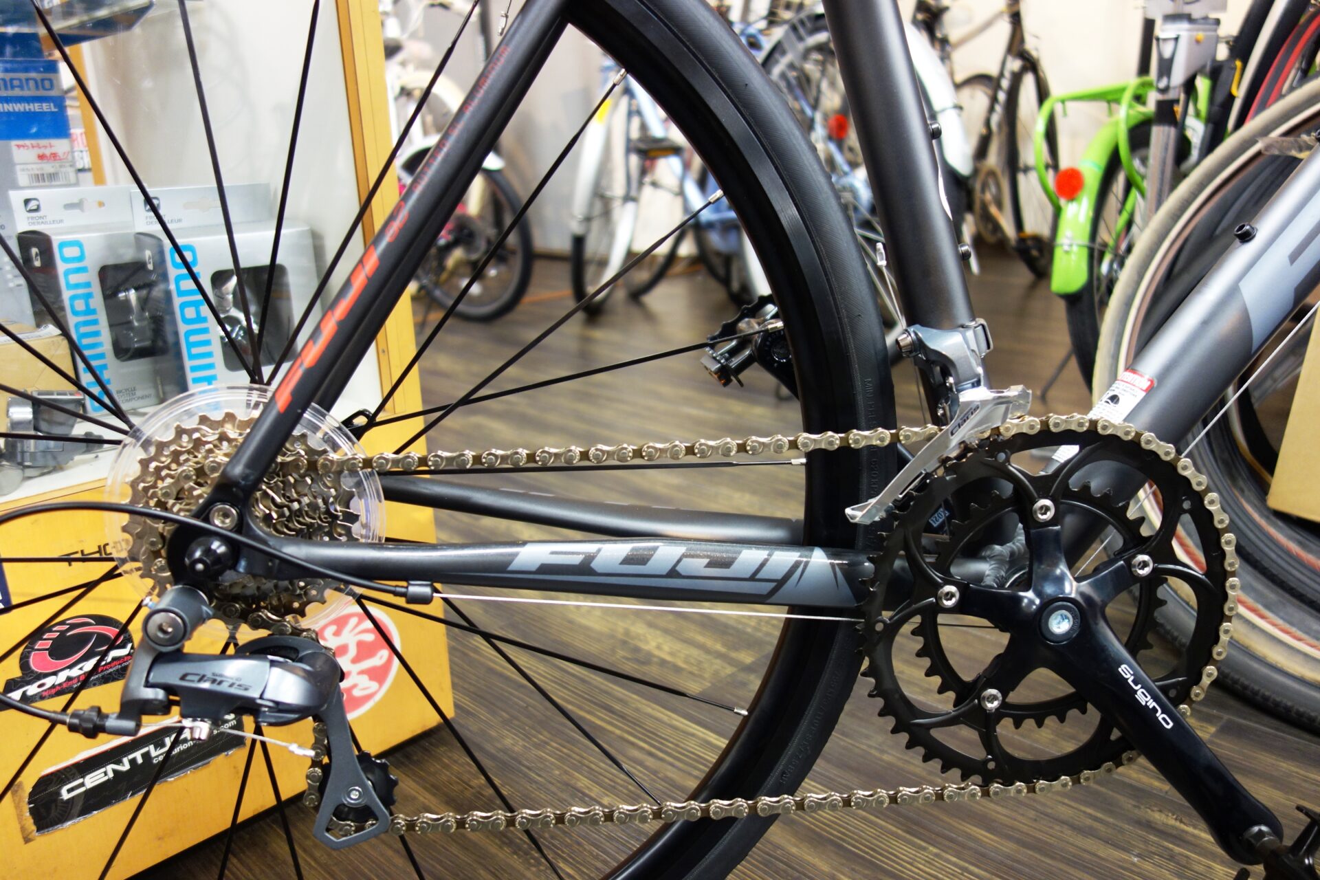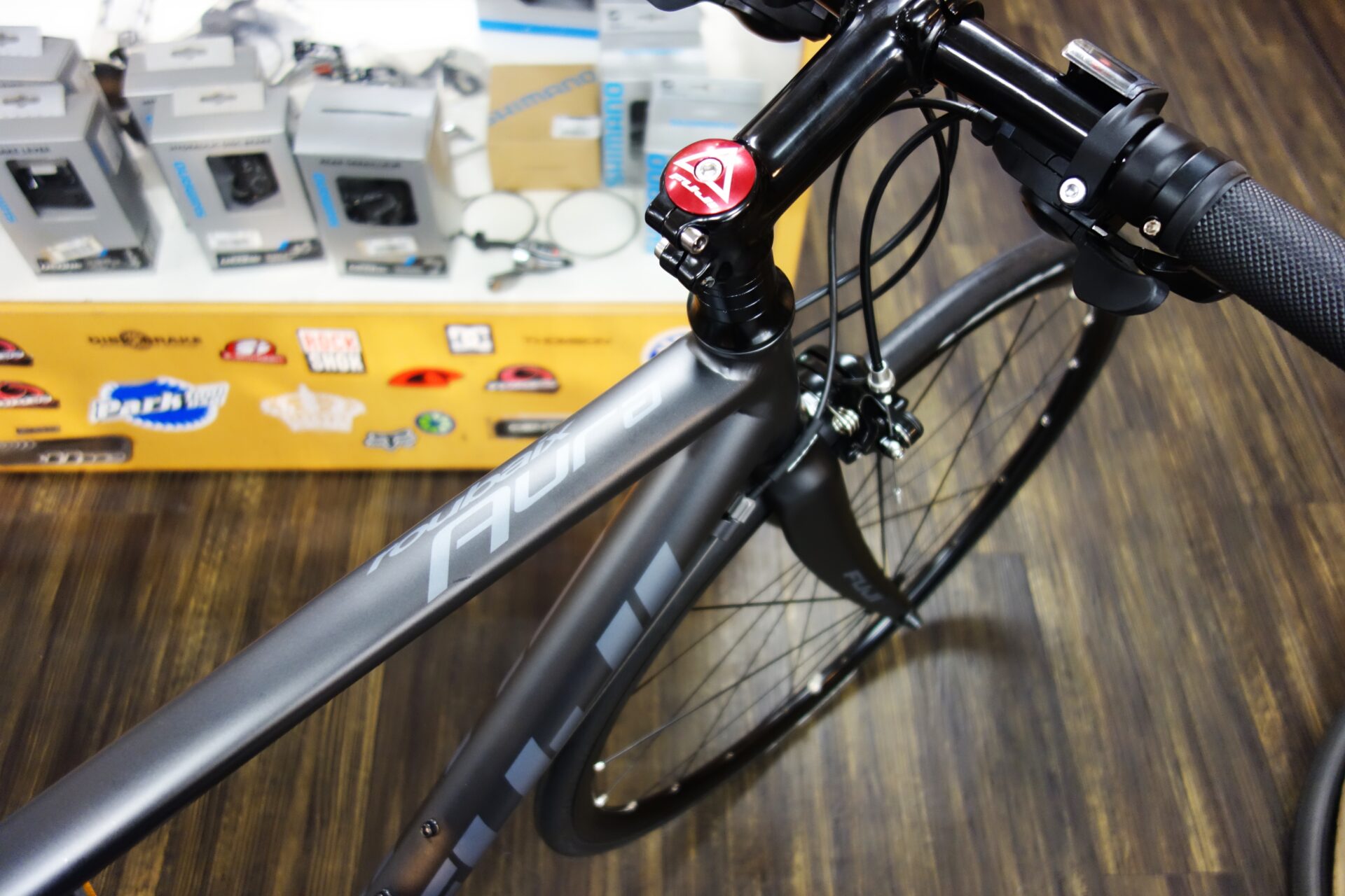 正面から見るとブレーキワイヤーの後ろから見えるFUJIのロゴがもうなんとも、カッコいいですね!笑