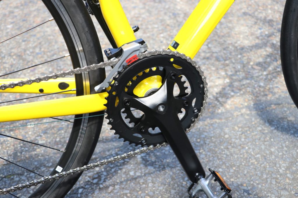 2x9SPEEDとなっていますが、ギア比ではむしろ軽い設定に変更されていますね。トップギアも少し軽めな設定なので、ロードバイクほどのトップスピードは難しい感じ。