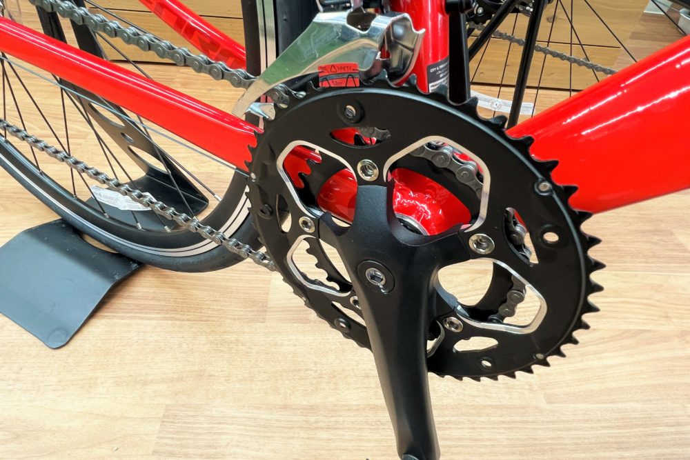 フロントのギアクランクは34T/50T。近年ロードバイクの主流になりつつあるコンパクトタイプですね。リアは11-32T。大きめのギアがついているので上り坂が楽ですよ~♪
