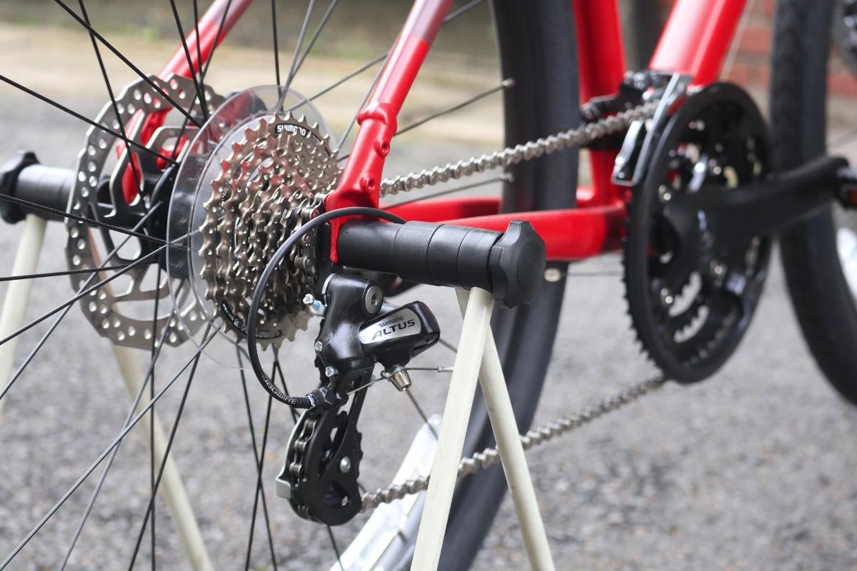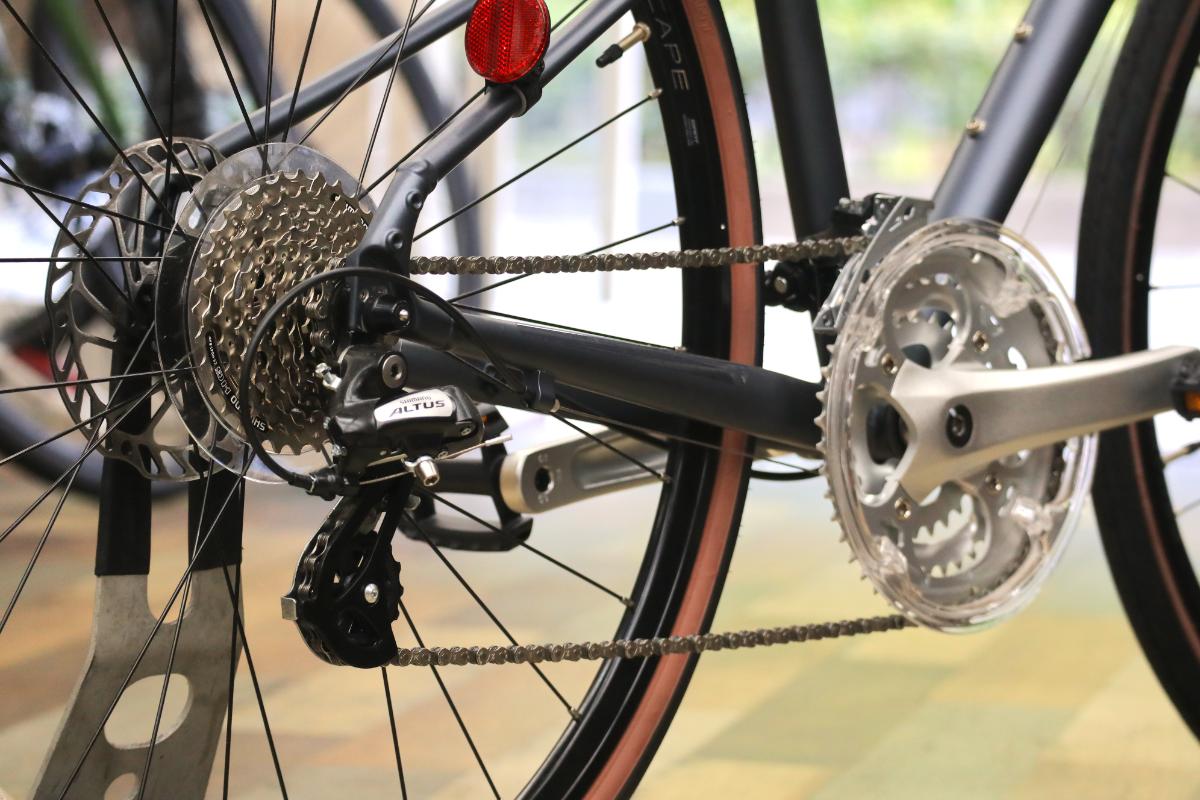 変速数は2×9SPEEDが採用。クランクギアにはパンツの裾巻き込み防止のバッシュガードが付属。