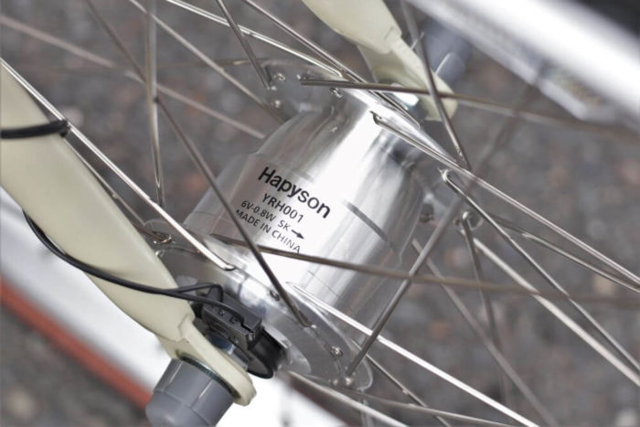 自分で操作する必要は一切無く、前の車輪の軸にコイルが入っていて動かすことにより誘導電流が発生して点灯する仕組みになっているので電球が切れたや電池切れなどの不安が全く無いのが嬉しいですね。