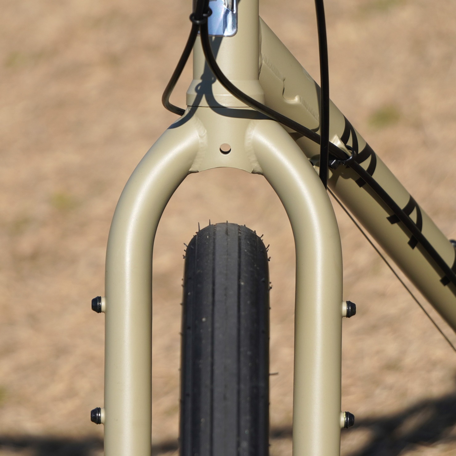 クロモリフレームならではのしなやかな乗り味と、太めタイヤによる安定感を活かし、