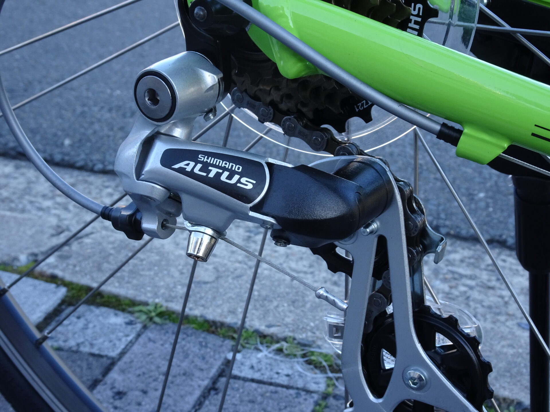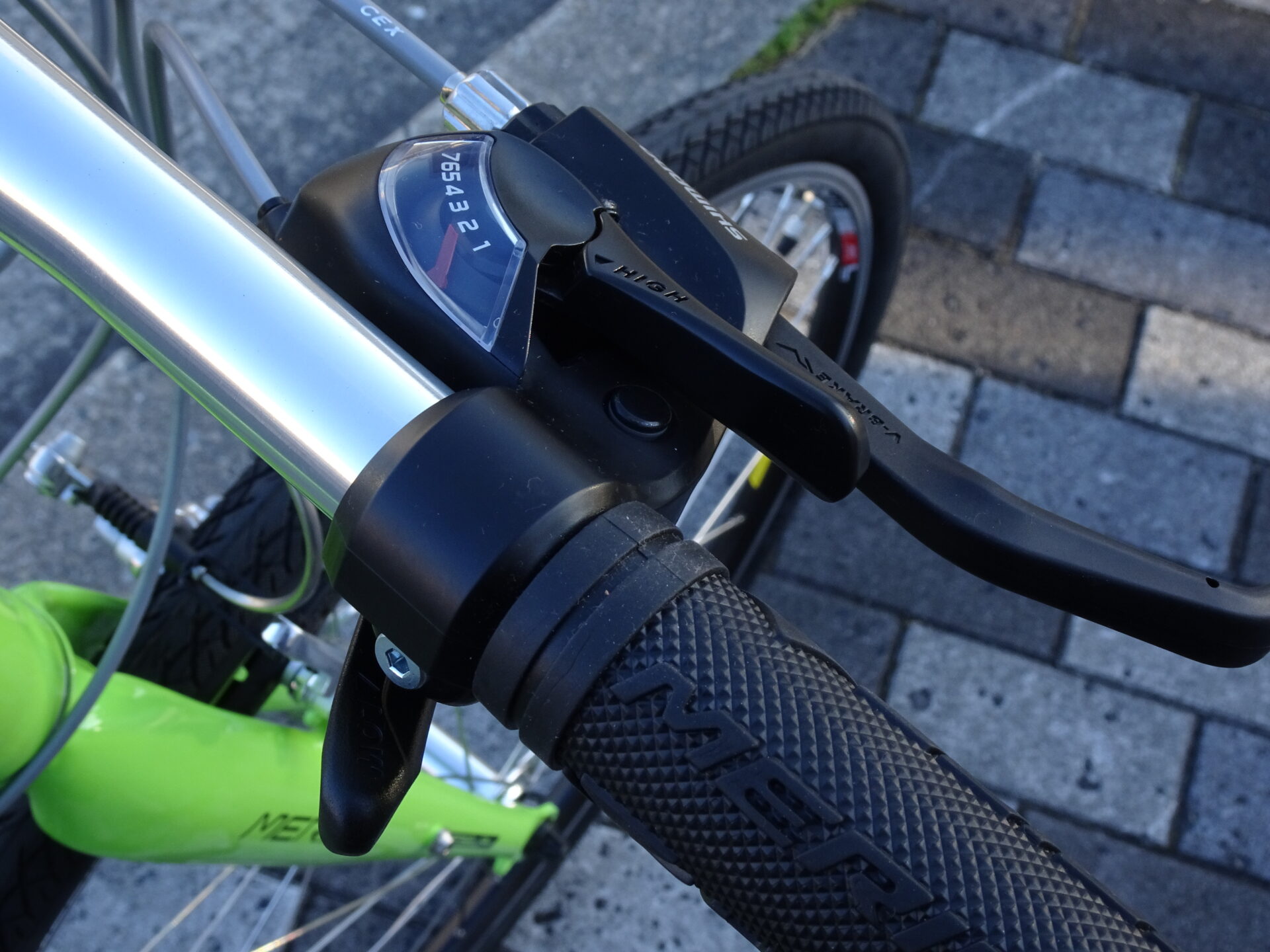 変速数は3x7の21段変速。手元のシフターSHIMANO・ST-EF41。初めてクロスバイクに乗られる方を考え、ウィンドウ越しに今ギアが何速に入っているか目で確認できるのがお客様思いでGOOD◎