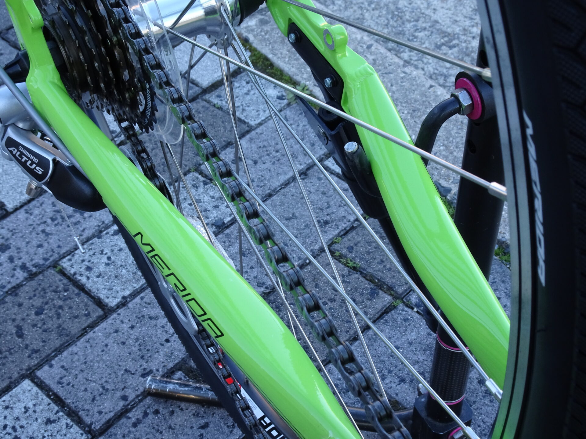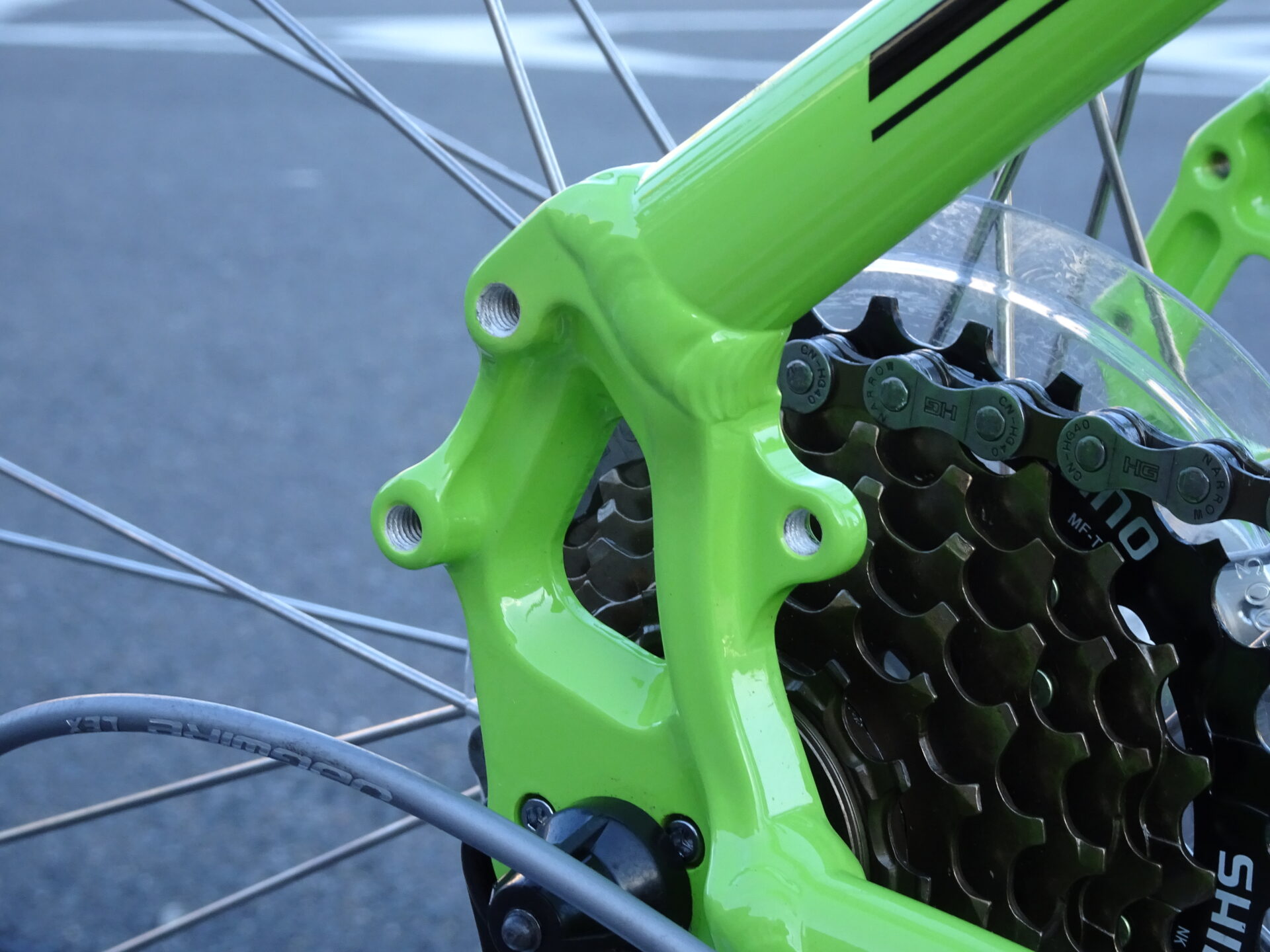 チェーンステーは横に扁平させた形でなんとも言えない存在感を放っております。(カマキリの足みたい)