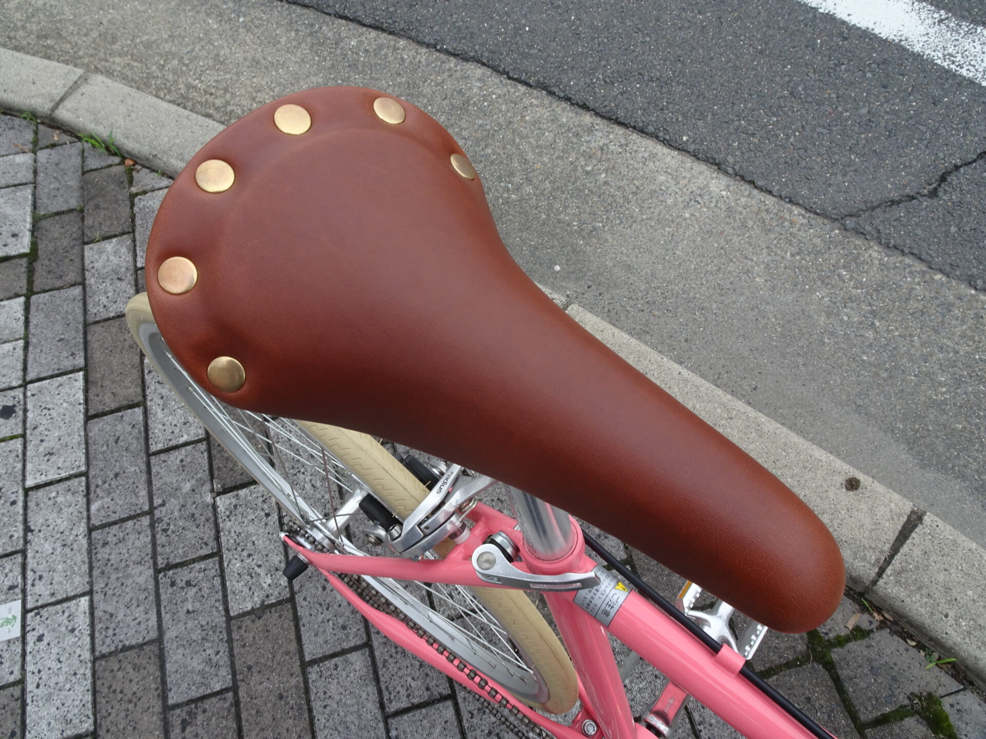 サドルは鋲付きのブラウンで車体のカラーとベストマッチ!