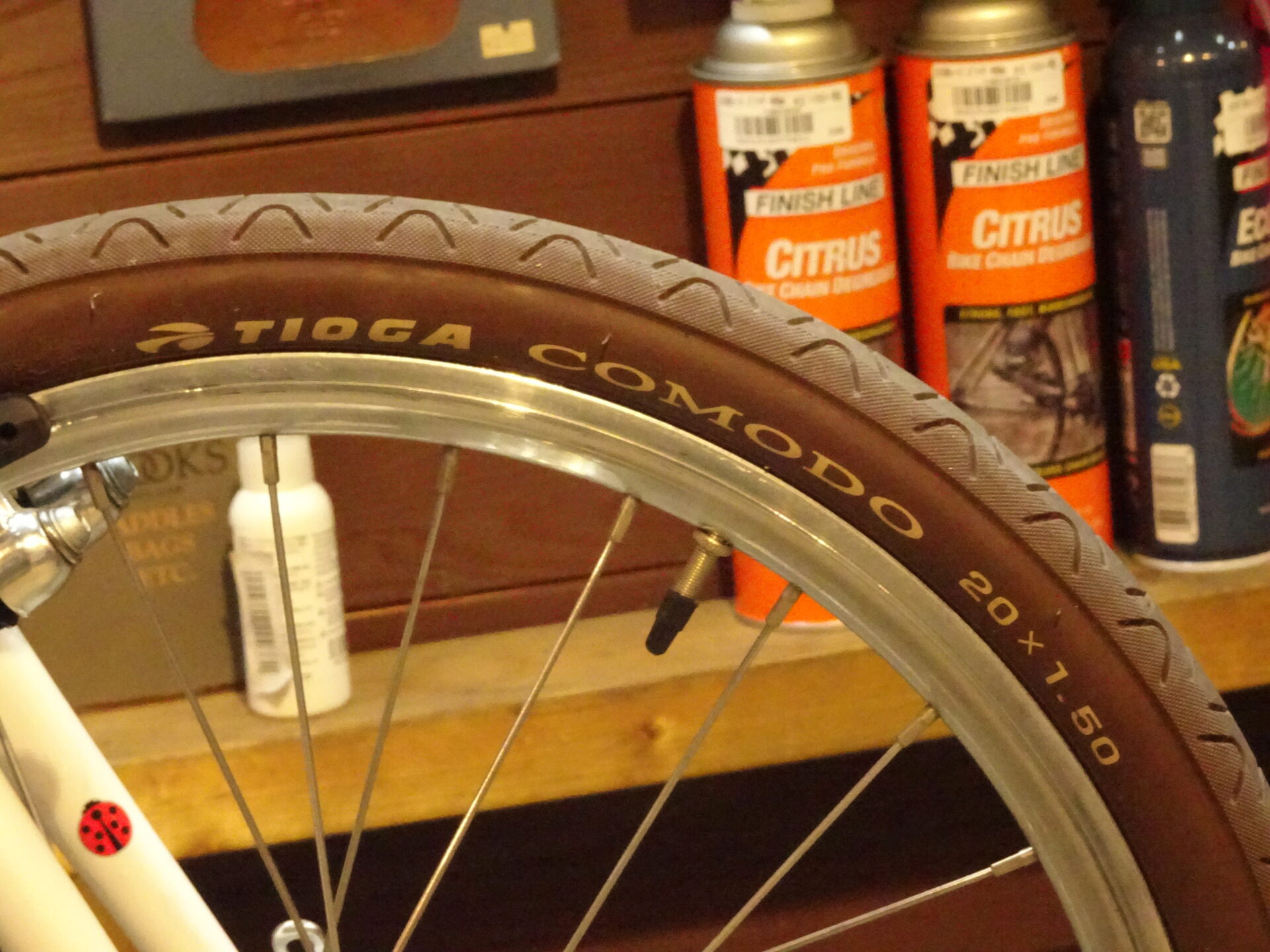TIOGAのコモドタイヤのブラウンですね。雰囲気に合ったカラーと、20x1.50という太くもなく細くもない絶妙なラインのタイヤ幅♪