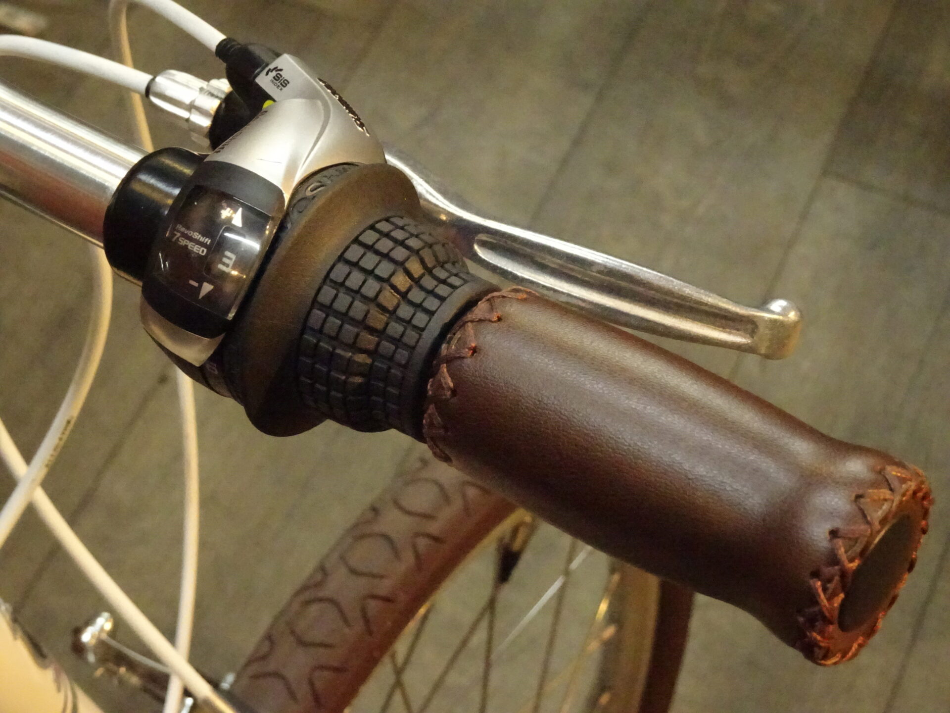 このML20は外装7段変速付きです。シフターのタイプは見ての通りグリップタイプ。ギアを重たくしたい場合は奥に回し、軽くしたい場合は手前に回す。ただそれだけ、非常に簡単に操作が出来ます。グリップシフターは手の小さな方でも容易に操作が出来るので女性の方でもしっかり使って頂けます。
