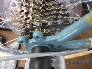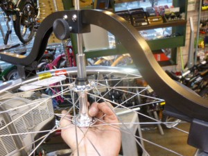 フレを取り取り、センター出し出しホイールとにらめっこです。自転車の命ですから入念に!