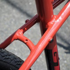 GTのオリジナルのフレームの設計方法でシートステーがシートチューブを通過しトップチューブまで延長して接合することで自転車本体の剛性を上げ、後ろ三角の大きさが小さくなるためにペダルを漕いだ時のレスポンスが向上します。