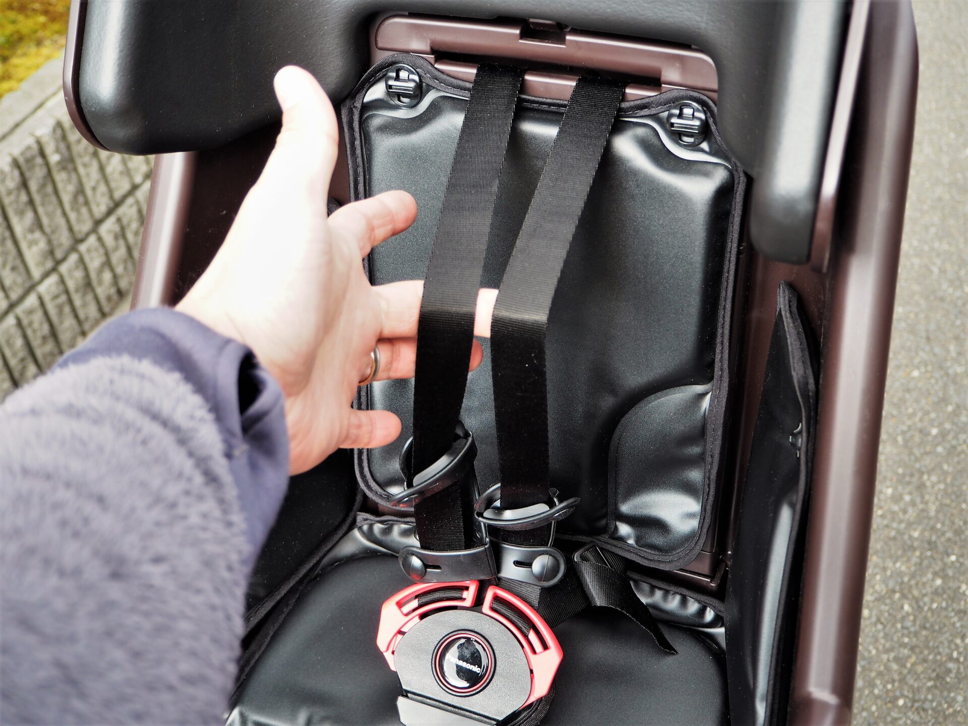 やり方は撮っても簡単チャイルドシートの背面にある赤いレバーを押しながらシートベルトを引っ張るとシュルシュルと肩紐が伸びるので、お子様を座らせてシートベルトを締めてもう一度背面レバーをおせば、はいっ。肩紐がぴったりの長さで止まります。
