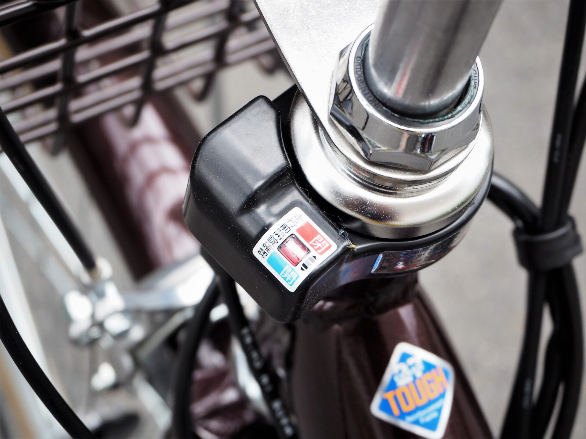 後輪錠をかけると自動的にハンドルがロックされる構造なので盗難に強いのはもちろんなのですが、前カゴに重い物を乗せているときやお子様を乗せているときにハンドルが回転して転倒するという危険性も少なくなります。