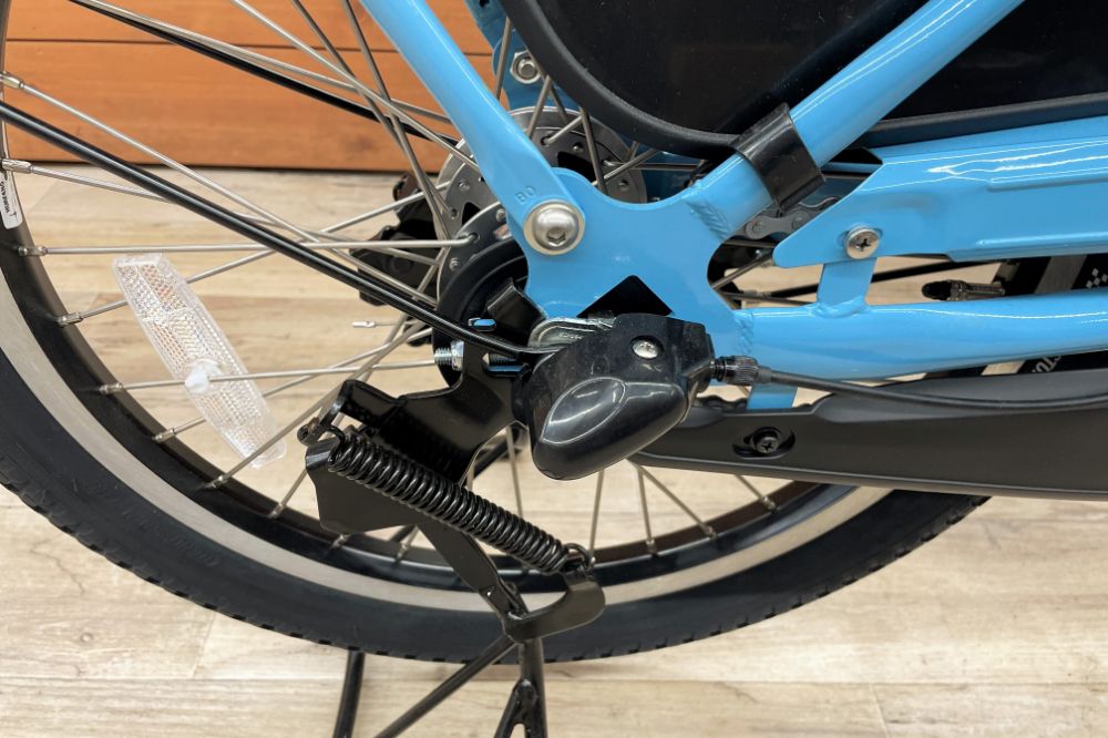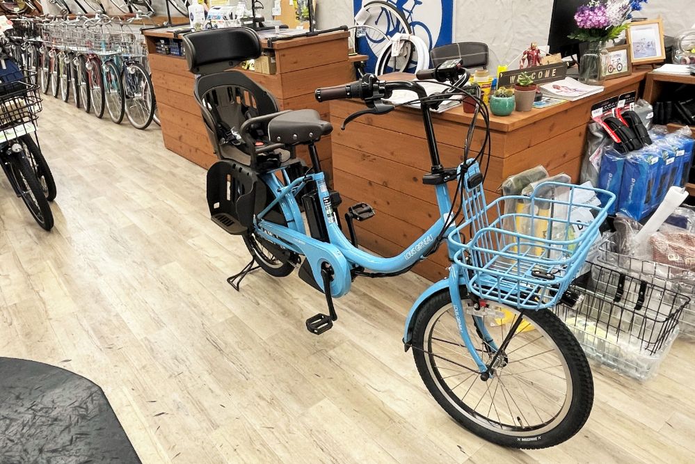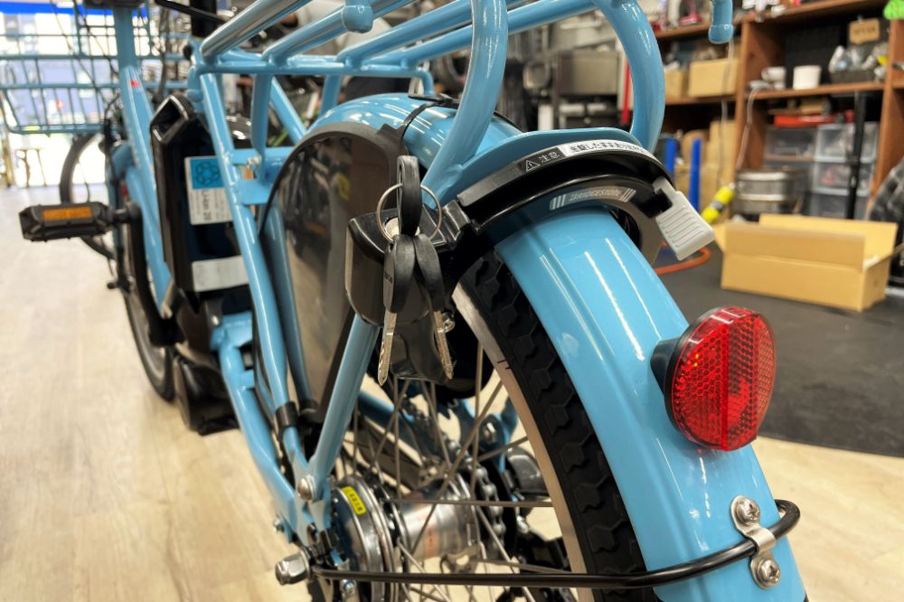 数ある子乗せ対応電動車の中でも、ひときわ目を引くカラーリング。カナディアンブランド・ルイガノらしいお洒落な色味です。女性に人気のブルー。