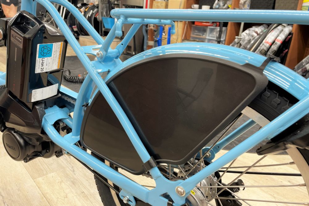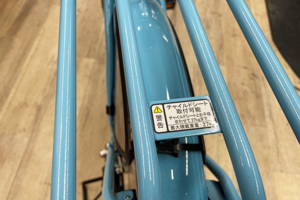 後ろの荷台も車体同色のブルー。いい感じの統一感。クラス27(27kg耐荷重)のキャリアなので、チャイルドシートが取付できます。