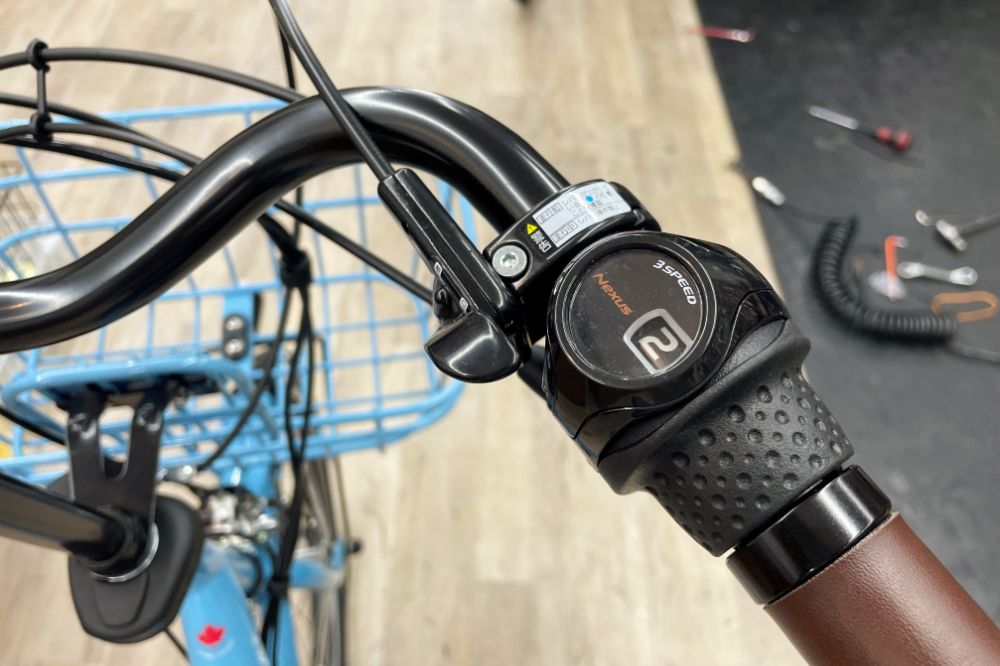 省メンテナンスの内装3段式ギア変速。右グリップを捻るとギアが切り替わります。左隣に見えるのが手元操作式のハンドルロックレバー。重い荷物を積載時やお子さんの乗せ降ろし時、とても重宝してくれます。