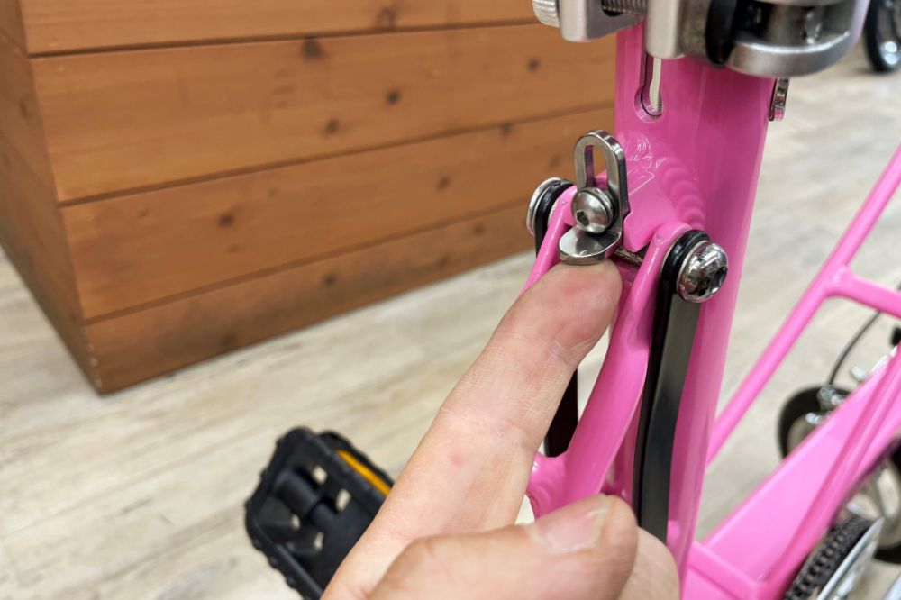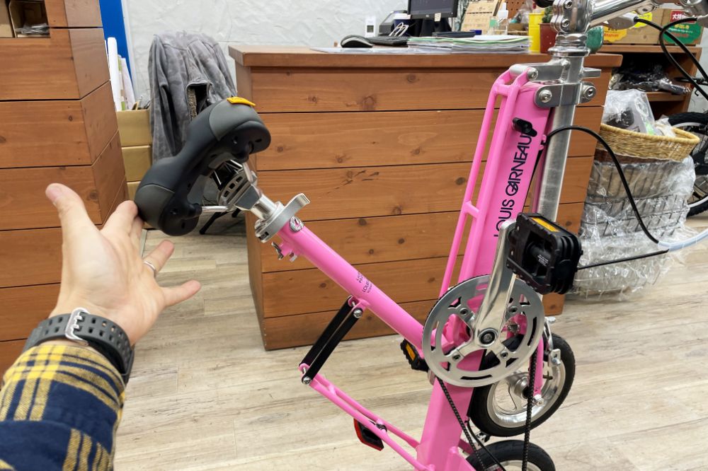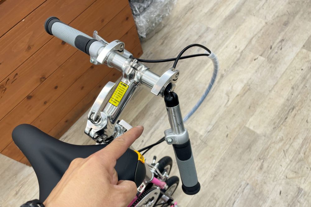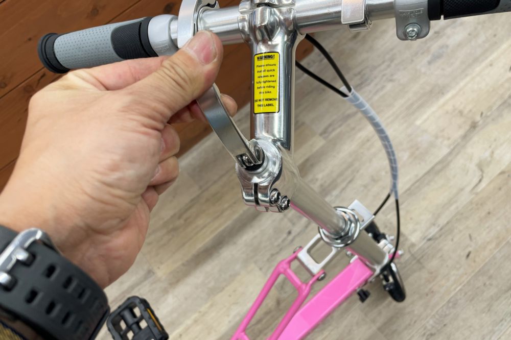 いったん車体を倒立させ、前三角(ハンドルポスト)を縮めて、トップチューブ、ダウンチューブ、ポストが平行になるように動かせます。映画「トランスフォーマー」的なメカニカルで、玩具的で、工芸品的な、このギミック感、デバイス感、如何ですか。痺れませんか。もちろん工具不要。