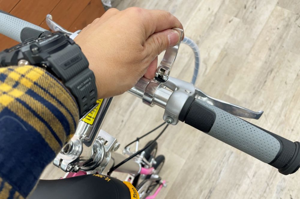 前後ともにコンパクト・シンプルなキャリパー式ブレーキ。万一の修理でも汎用パーツで転用できるのでアフターメンテナンスは安心ですよ。