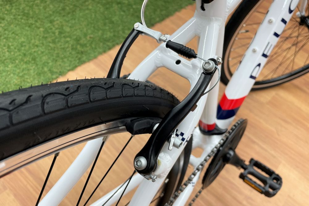 前後ブレーキはVブレーキ。制動力がしっかりしているので安心です。Vブレーキはとてもメジャーな規格なので、対応のカギや台座などの取付カスタムがしやすいです。