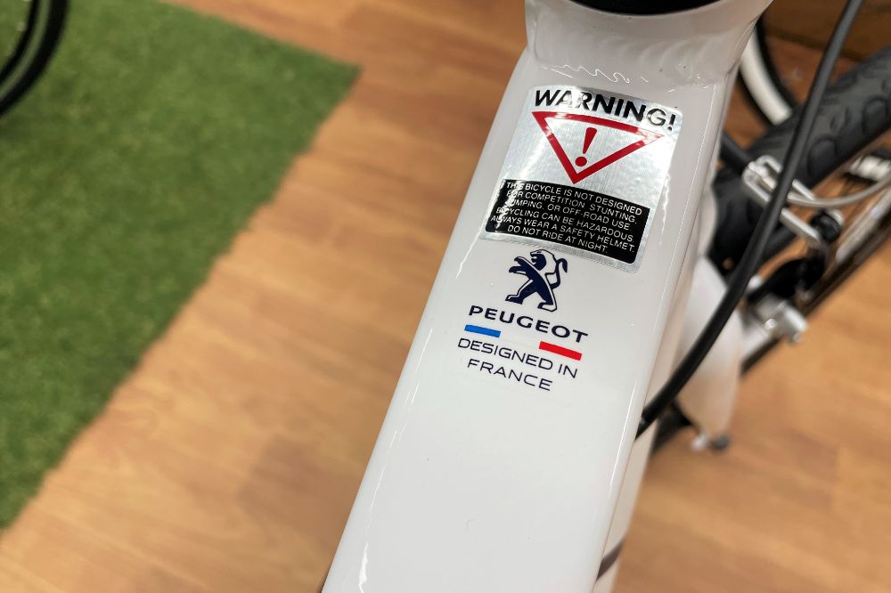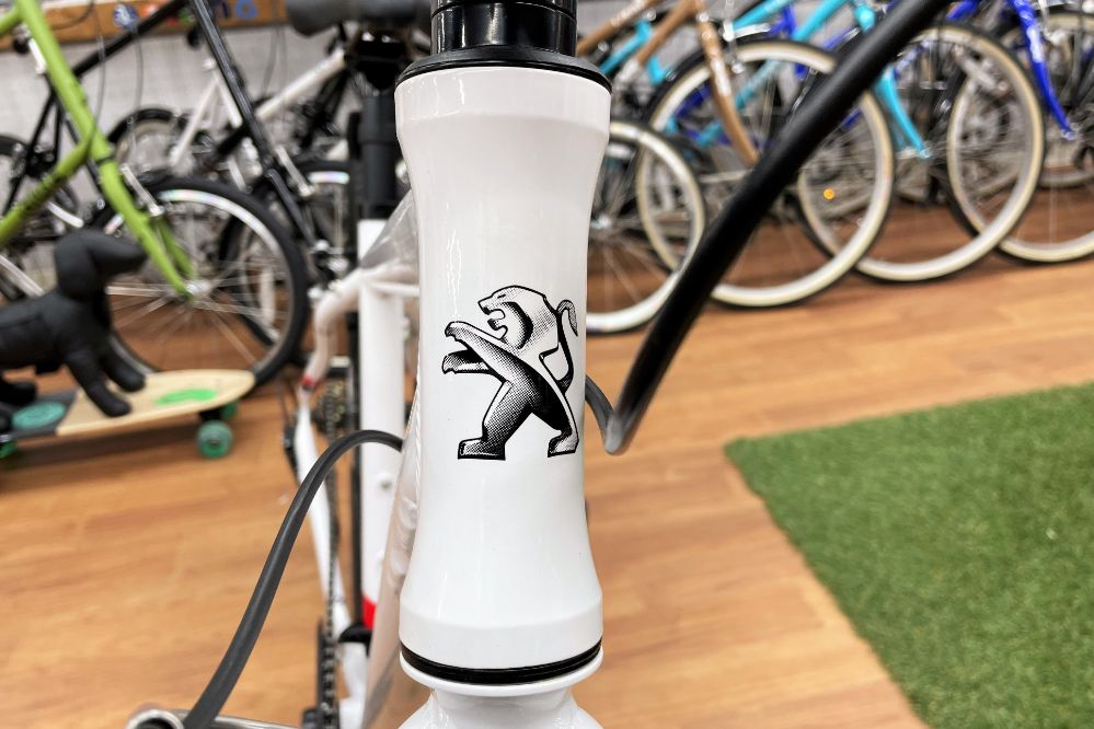 ヘッドチューブに輝くライオン!金物加工のプジョー創業時から200年近く継承してきた、お馴染みのシンボル。フランスでは百獣の王・獅子は守り神の意味があるらしいです。トップチューブに光る「DESIGNED IN FRANCE」の文字もカッコいい。
