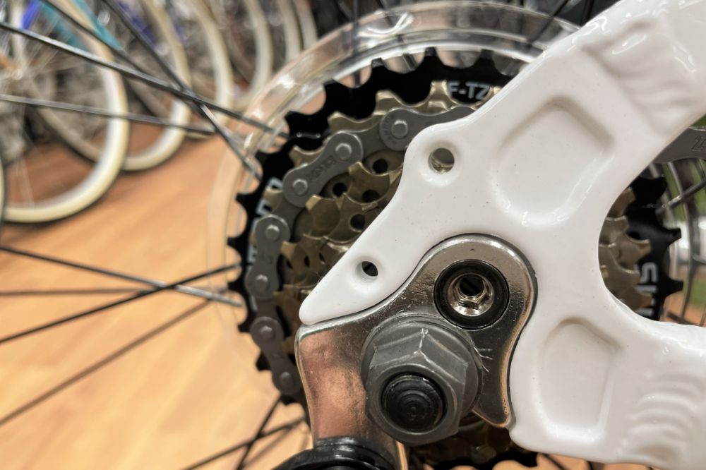 リアスプロケットはマルチフリー(MF)式の7S。カセット式ほど本格的ではありませんが、日本中どこの自転車屋さんでも修理できる汎用性が◎ ディーレーラーも一般的なSHIMANOターニー。フロントはチェーンが落ちにくいガード付きのギアクランク(シングル)。