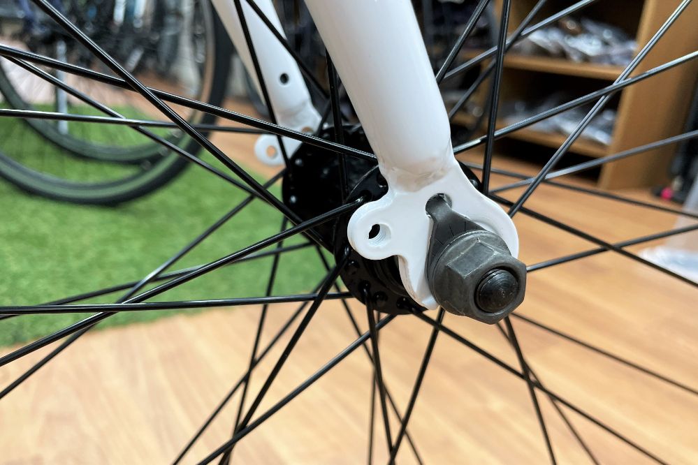 フロントフォークのエンド部と、フレームリアのエンド部にダボ穴があります。後付けでフェンダーだったり、キャリアだったり、ラックやバスケットだったり、カスタムのしやすさもGood。
