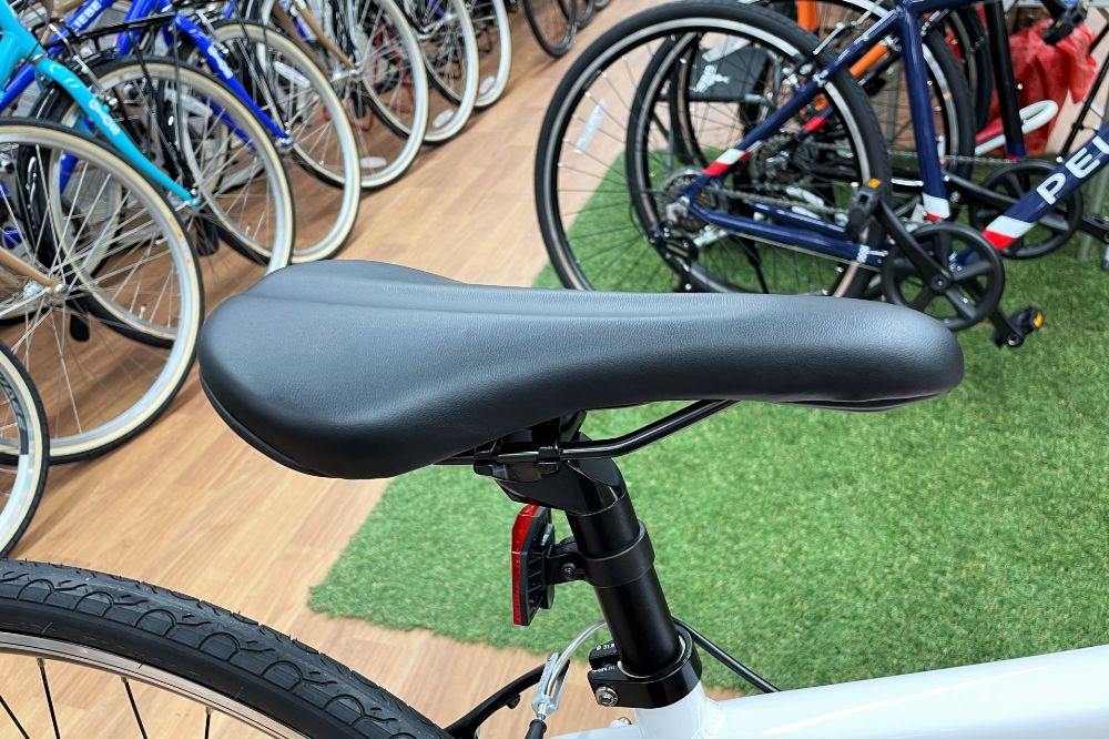レール式・スポーツ仕様のサドル。シュっと細身&シンプルなデザイン。クッション厚めのサドルなど後々のカスタムが容易なので、お好みで換装してもOK!