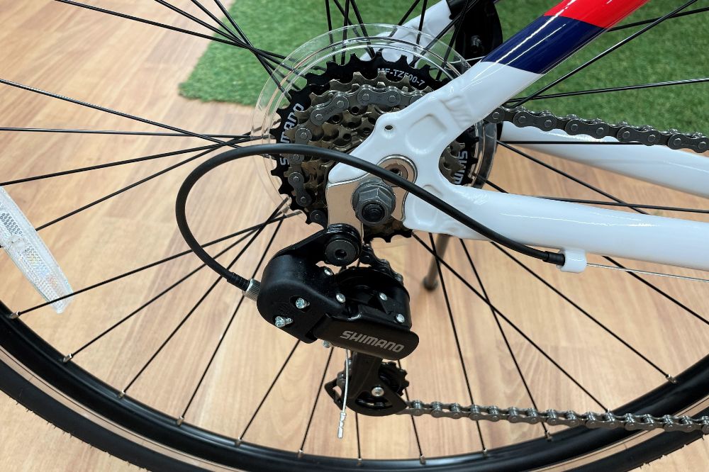 世界的ブランドのSHIMANO。安心品質ですね。レボ式(グリップ回転式)シフター×リア7段変速を採用。汎用的な部品なので入手しやすい。街乗りメインならOKだと思います。右手だけに集中しましょう。