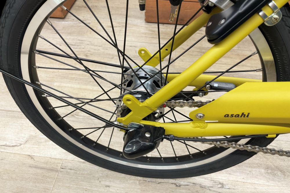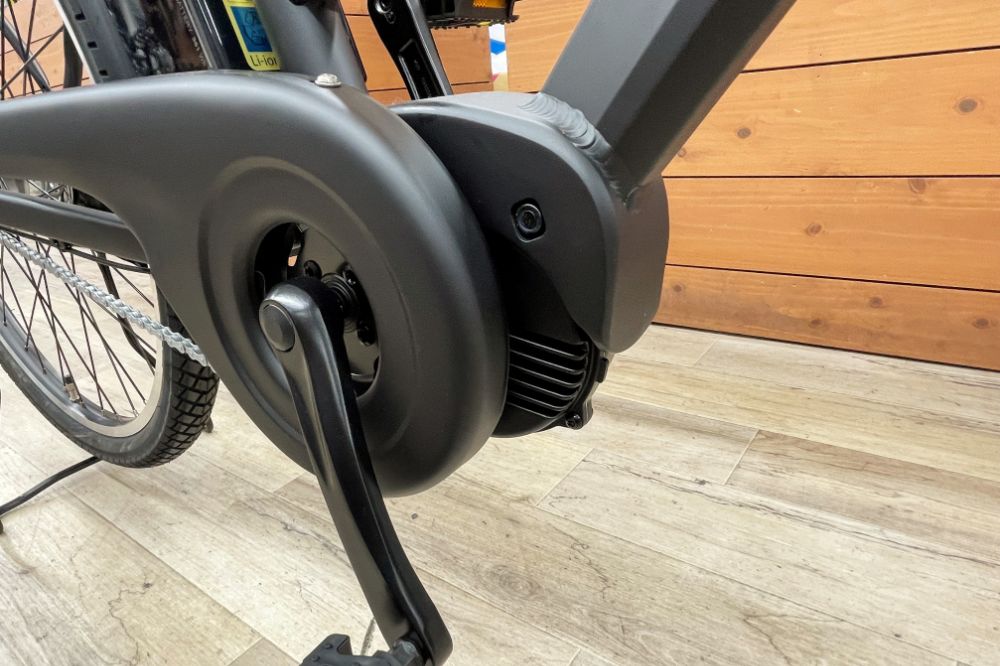 クランク回り。あさひオリジナルの電動ユニット「PLUS-D」を搭載。一般的な電動ユニット(2軸式)と異なり、スポーツ車などに多い1軸式なので小型軽量、見た目もスッキリ。デザイン性がアップしていますね。あ、試乗した感想としては、とても音が静かでした。アシスト力はそこそこ十分、快適です。