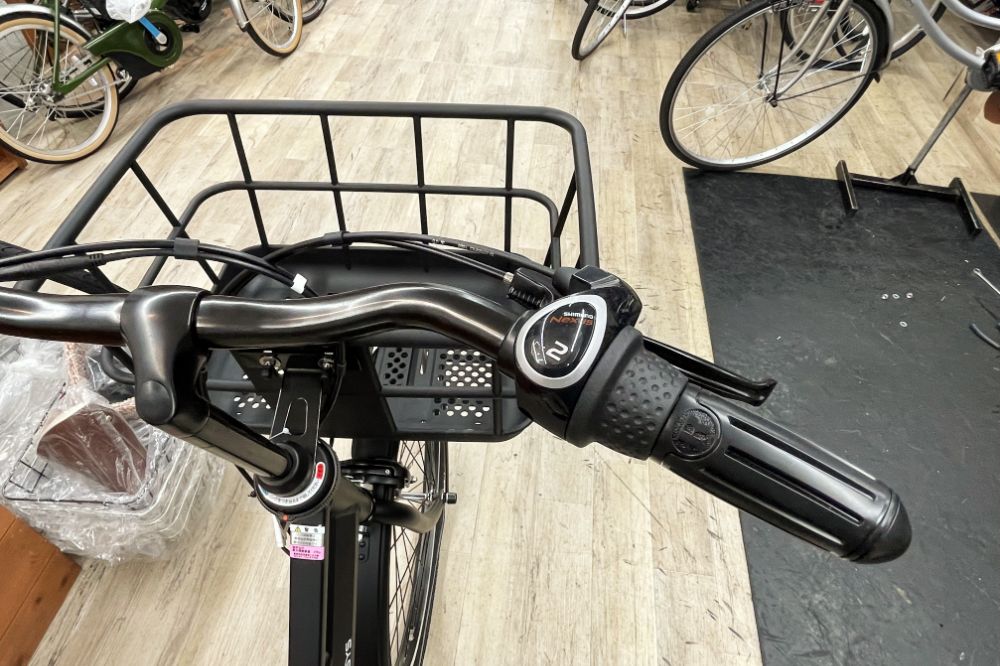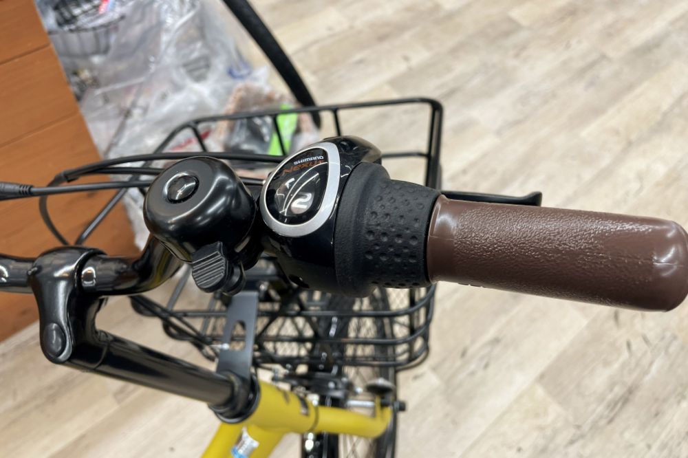 変速シフターはグリップレボルバー式(回転式)。シマノの内装3段式なので、見た目スッキリ。変速トラブルの少ない、省メンテナンスなところも普段使いに嬉しいですね。