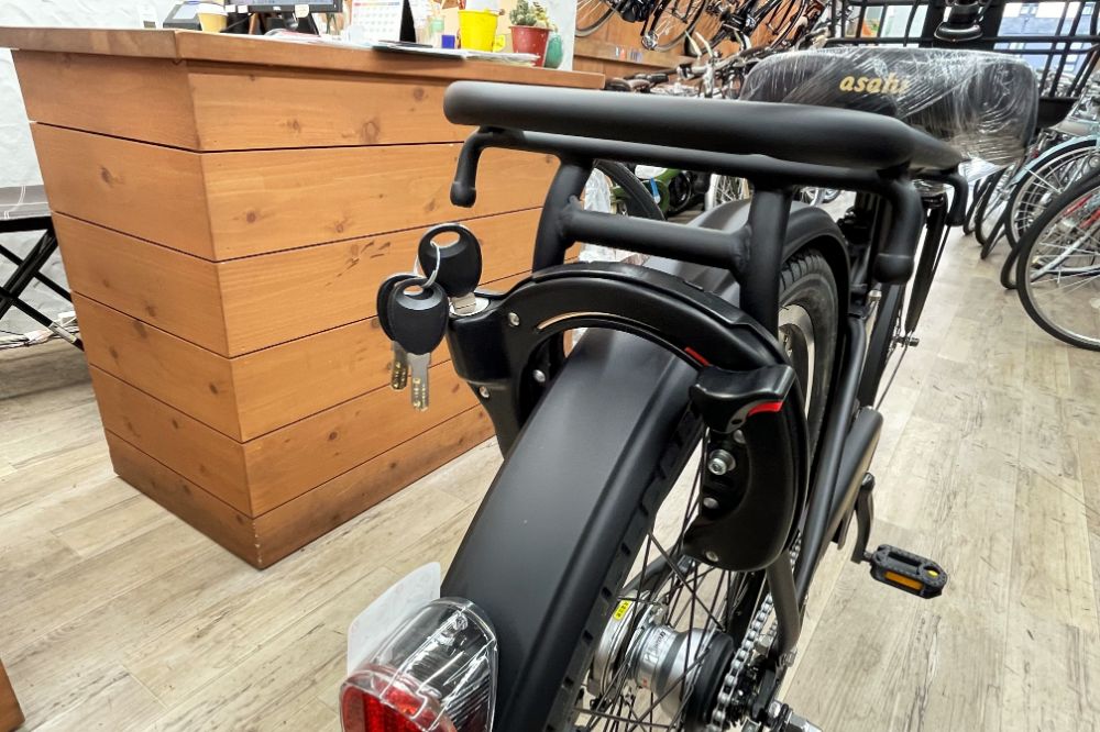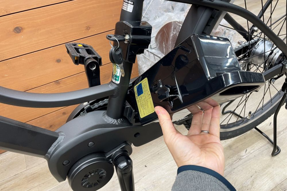 バッテリーのセキュリティーもしっかり。サークルロックと共通の鍵で開閉できます。一般的な着脱方式なので違和感なく使えます。
