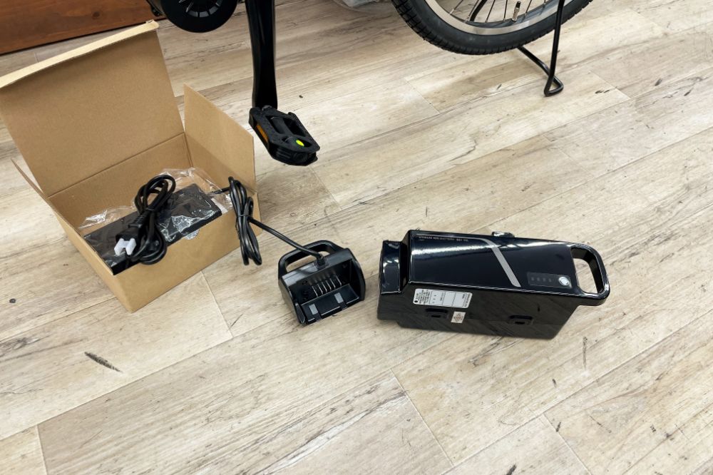 充電キット。家庭用コンセントでOK。バッテリーのお尻の端子部分にターミナルを差し込みます。充電スタンドに立てるタイプではないので、最初の慣れが必要かな…。