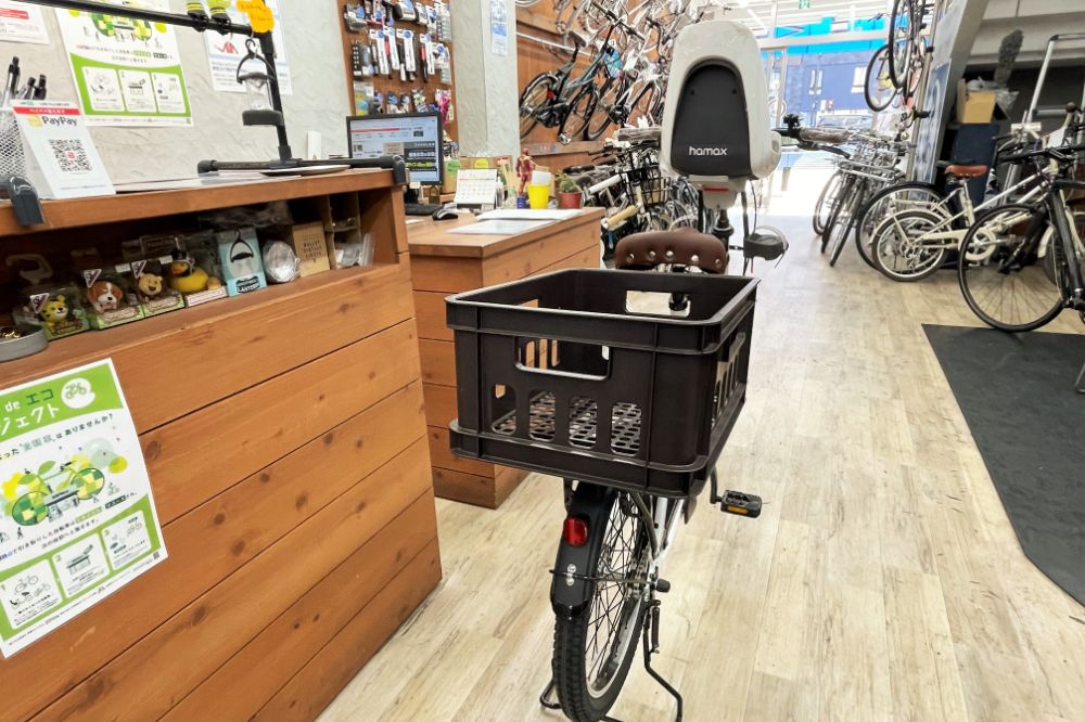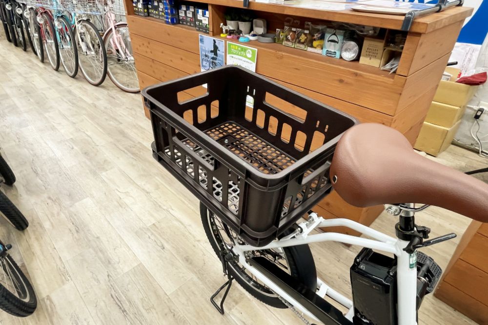 エイリン五条東洞院店オリジナル、前子乗せ&後ろに荷物入れバージョン。子育て中のパパママも安心!保育園の送迎もお洒落にいきましょう~♪ 帰りにたくさん買い物してもOKです!