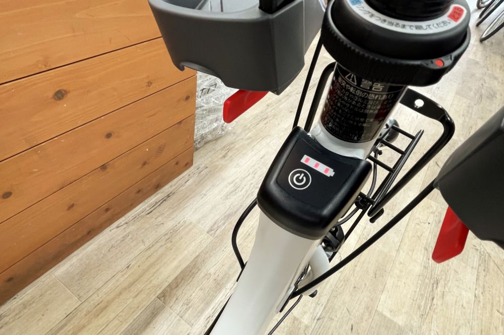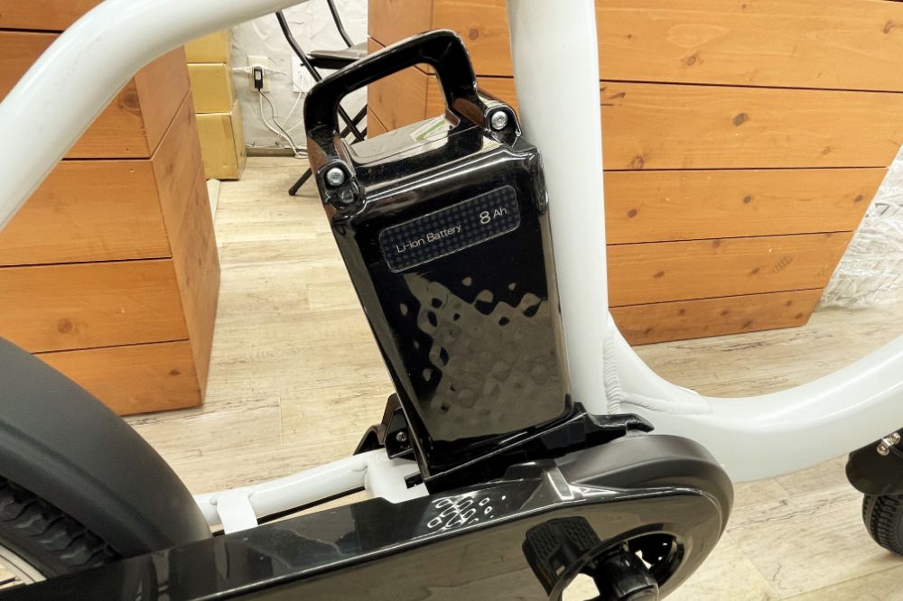 バッテリーはコンパクトモデルの8Ahを採用。満充電で約36km走行できます。ハンドルの下部にスイッチボタンとインジケーター。とてもシンプルです。