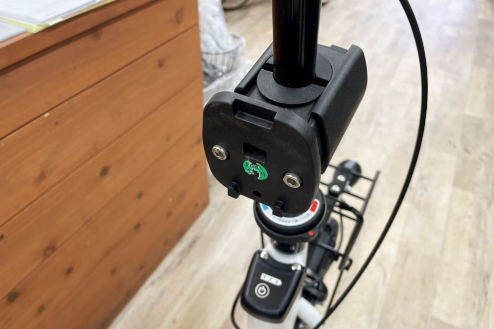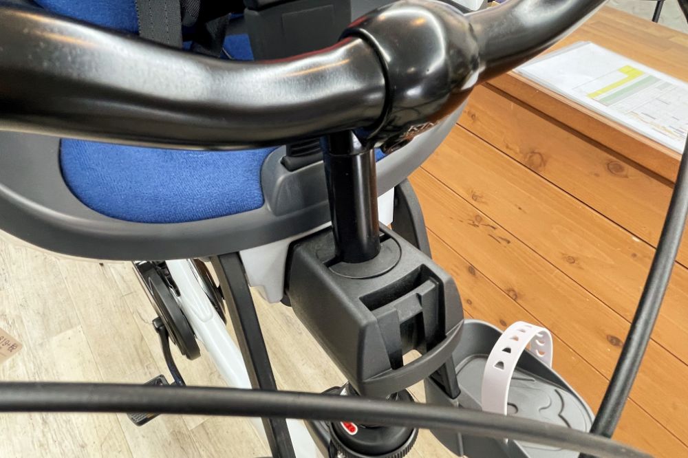 取り外すと、こんなイメージ。ハンドル回りがスッキリ。「子どもが大きくなったけど、たまに乗せる時もあるんです」。お母さん&自転車、あるあるの悩みも解消!必要な時だけ付けてOK。