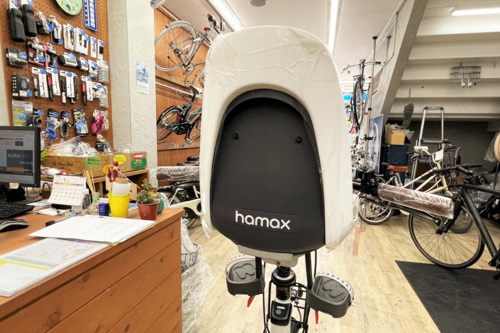 フロントチャイルドシートは、hamax(ハマックス)のカレスオブザーバー(税込み14,080円)。ハンドルポストに固定します。前面に風防のスクリーンも取付可能。防寒に重宝しますよ。