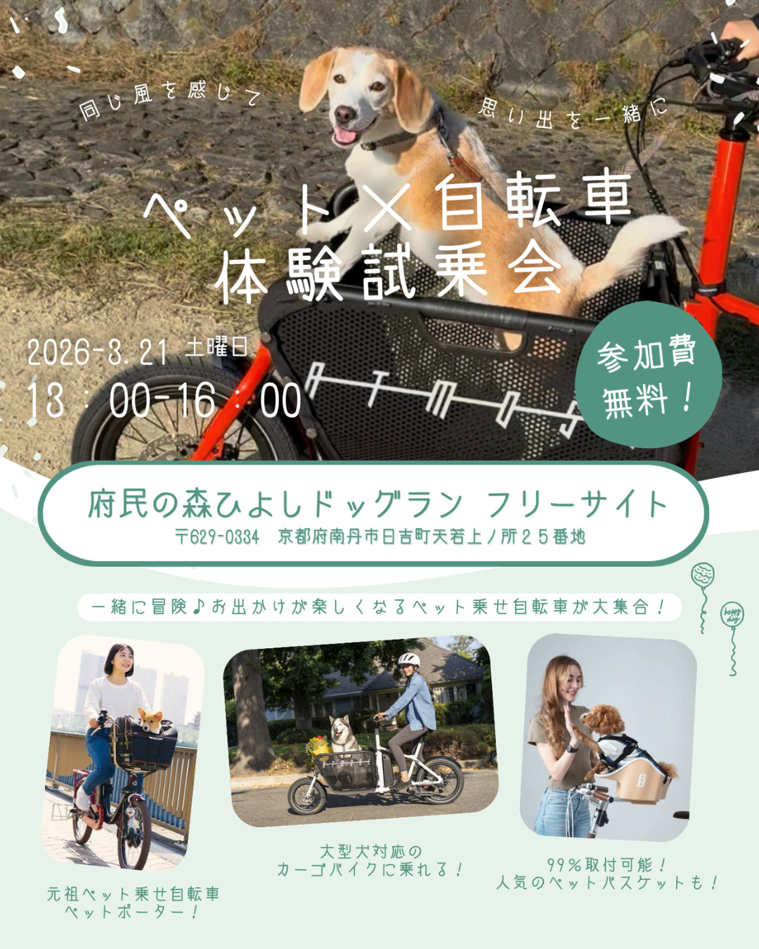 ペット×自転車の体験試乗会受付開始!府民の森ひよしドッグランにて【3/21(土)13~16時】Wan!Pass登録必須!