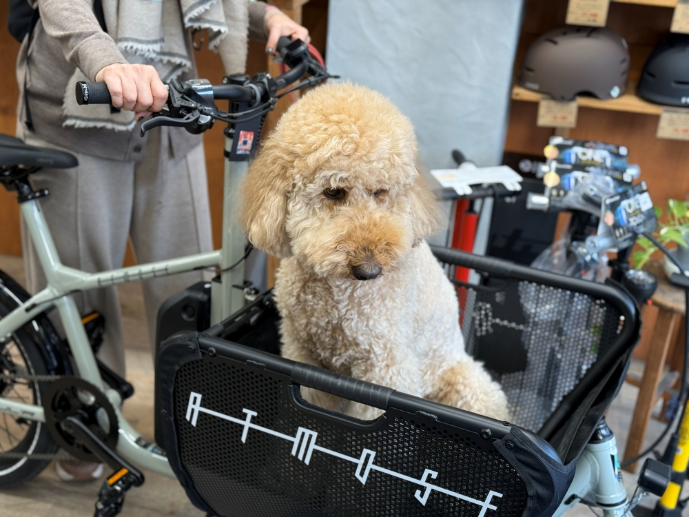 多くのお問合せを頂くカナダ発のワンコ専用自転車シート。それをパナソニックEZに取り付けた試乗車をご用意。