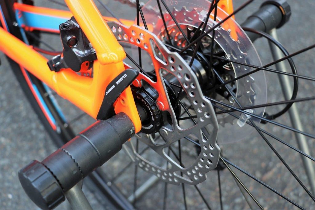 フロントハブにはスルーアクスルが採用され、ディスクブレーキの制動力をしっかりとキャッチ