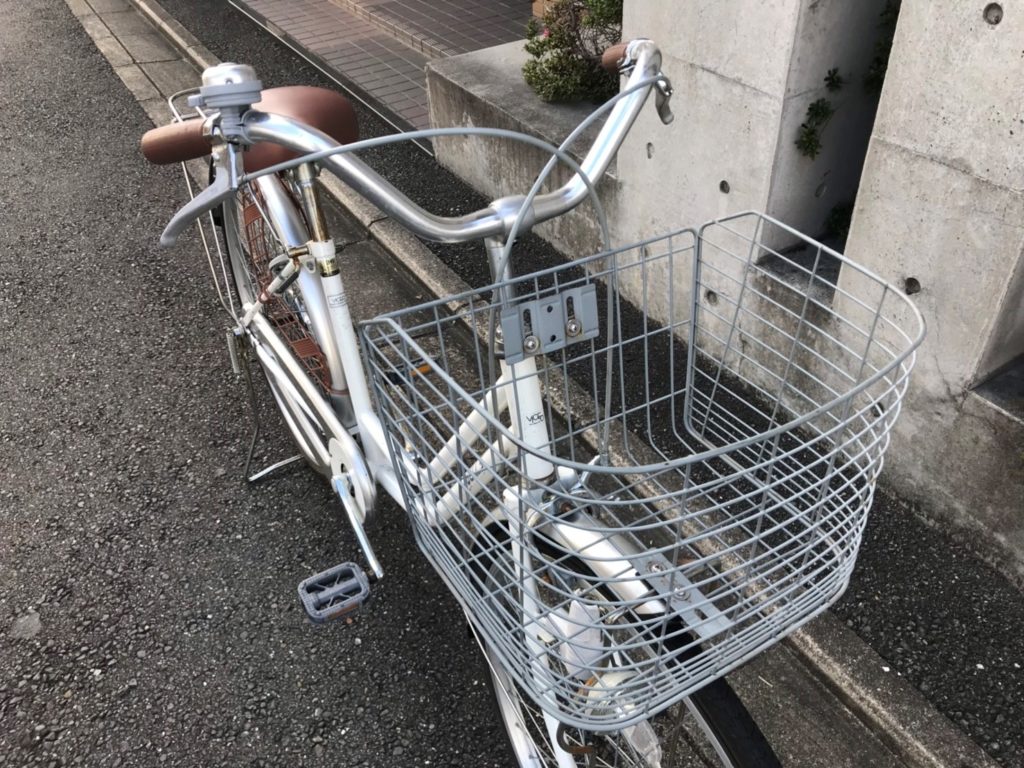 装備はカゴ、摩擦式のダイナモライト、前カギなど必要最低限ですがちょっとした移動に大変便利!