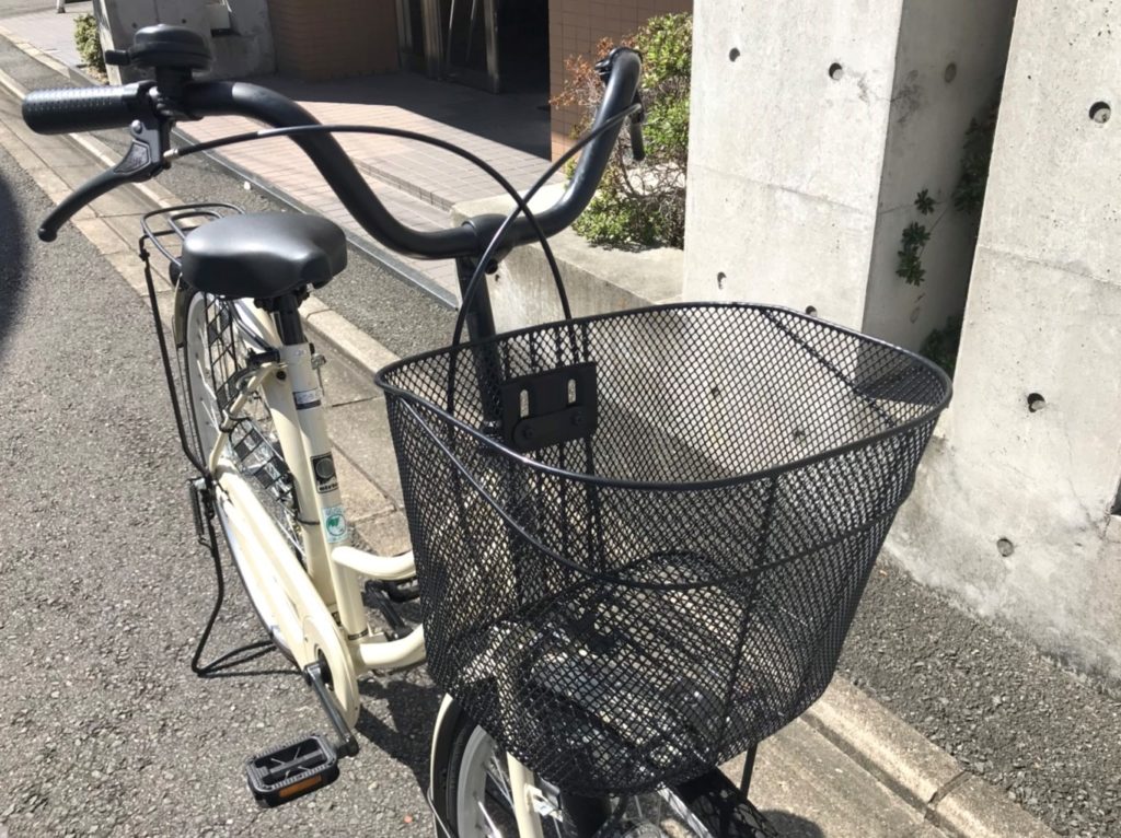 大きめのワイヤーカゴとタイヤが新品部品でメンテナンスされた可愛い中古自転車。