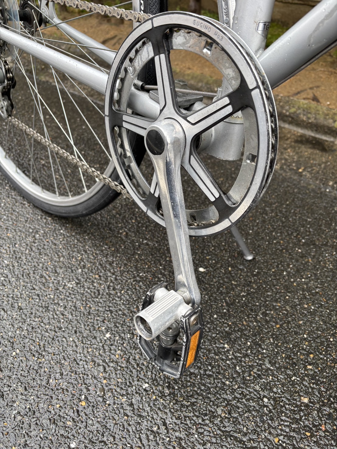 グランテックシリーズの中でも初期の方に製造されたモデルだけあって、どうしても車体各部には年月の経過を感じさせる傷がチラホラとできてしまってはいます。しかしながらそういった部分もディテールの一つとして楽しむのもレトロ自転車の醍醐味というものではないでしょうか?リアディレイラーの直線的でゴツいデザインも個人的には非常に好みですね~。